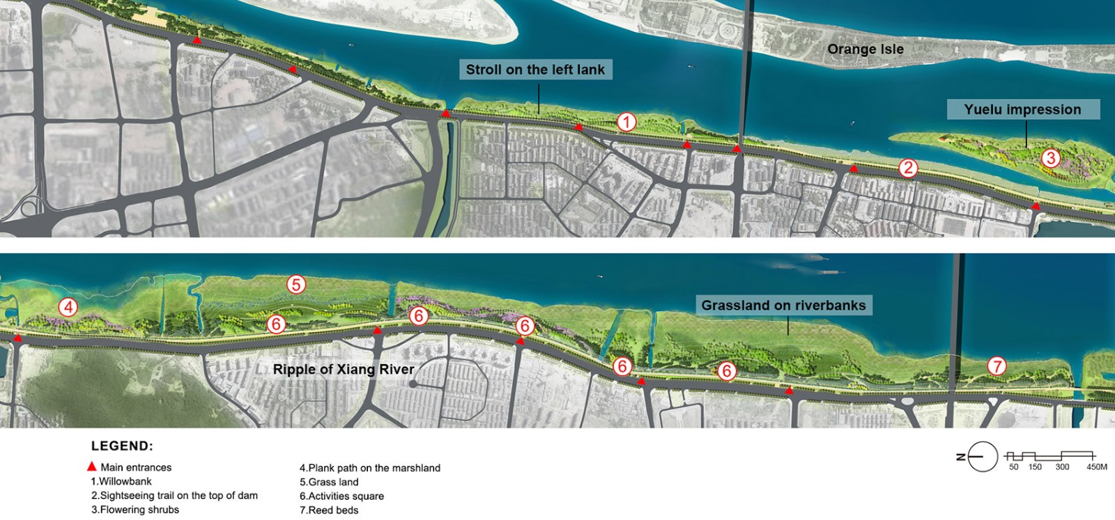 項目基地位于長沙市湘江西岸的江灘,總長度約為10公里,寬度約50到300米,總面積約為154公頃。東與橘子洲風景區(qū)隔江相望,西與岳麓山風景區(qū)遙遙相對,周邊高校云集,占據(jù)絕佳的地理位置。