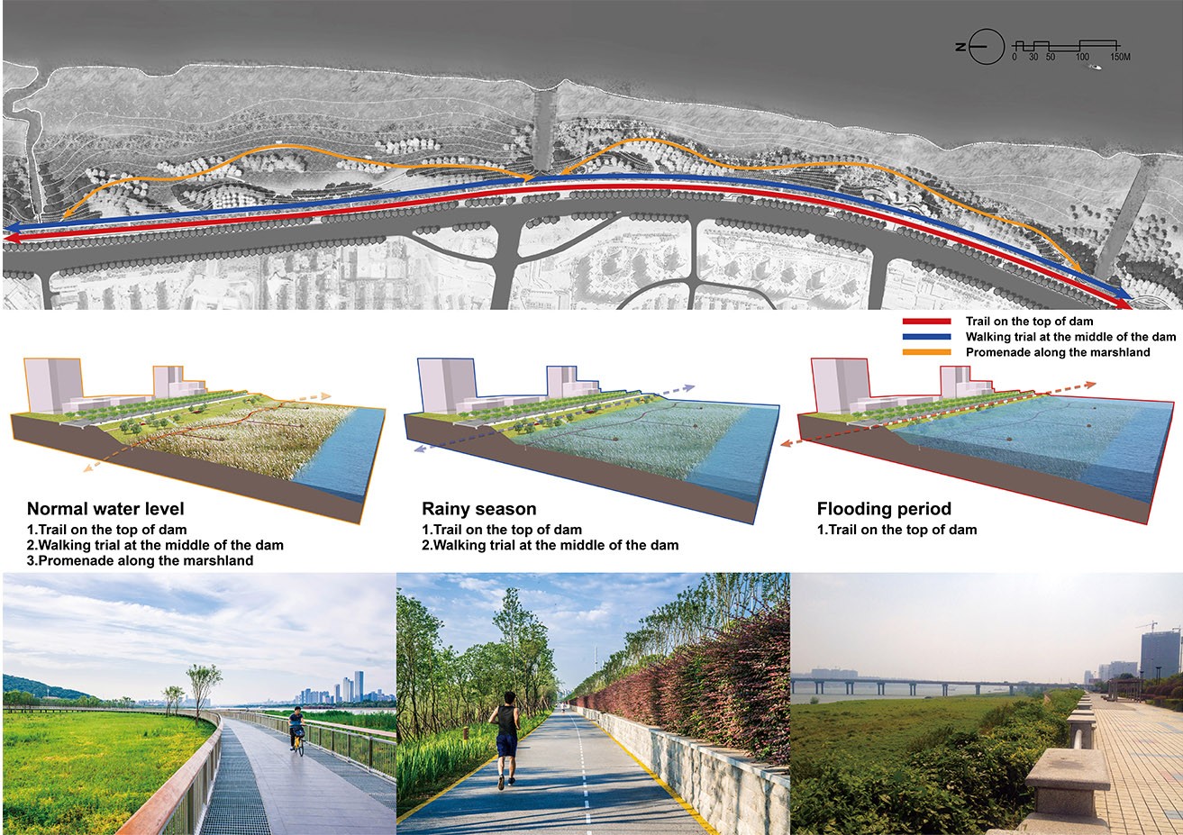 活動空間的分層設計最大限度滿足市民活動需求:為適應不同水位的活動及觀景功能,設計考慮了堤頂觀光步道、堤腰綜合慢行道、灘地悠游步道三種不同高程的步道系統(tǒng)。