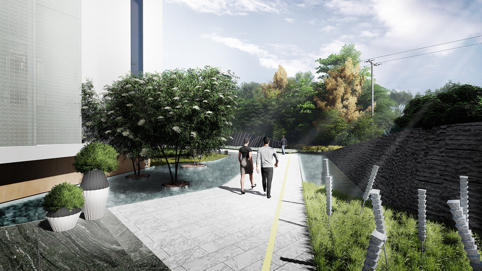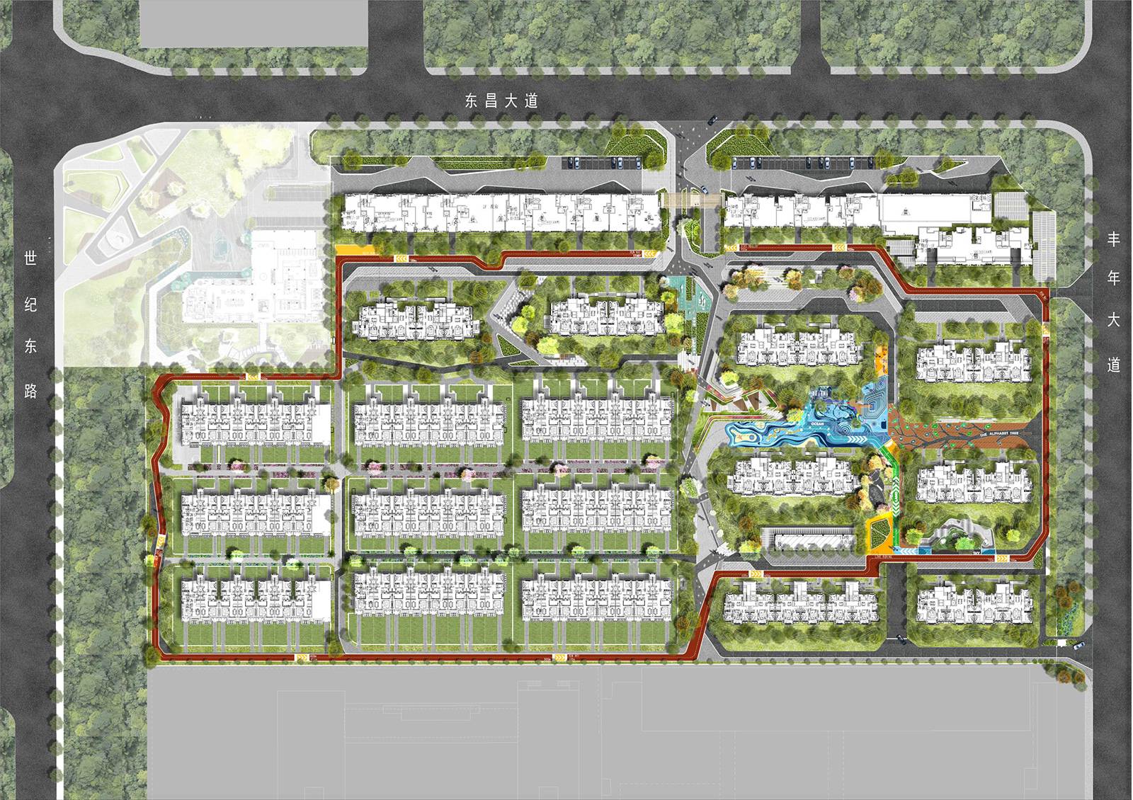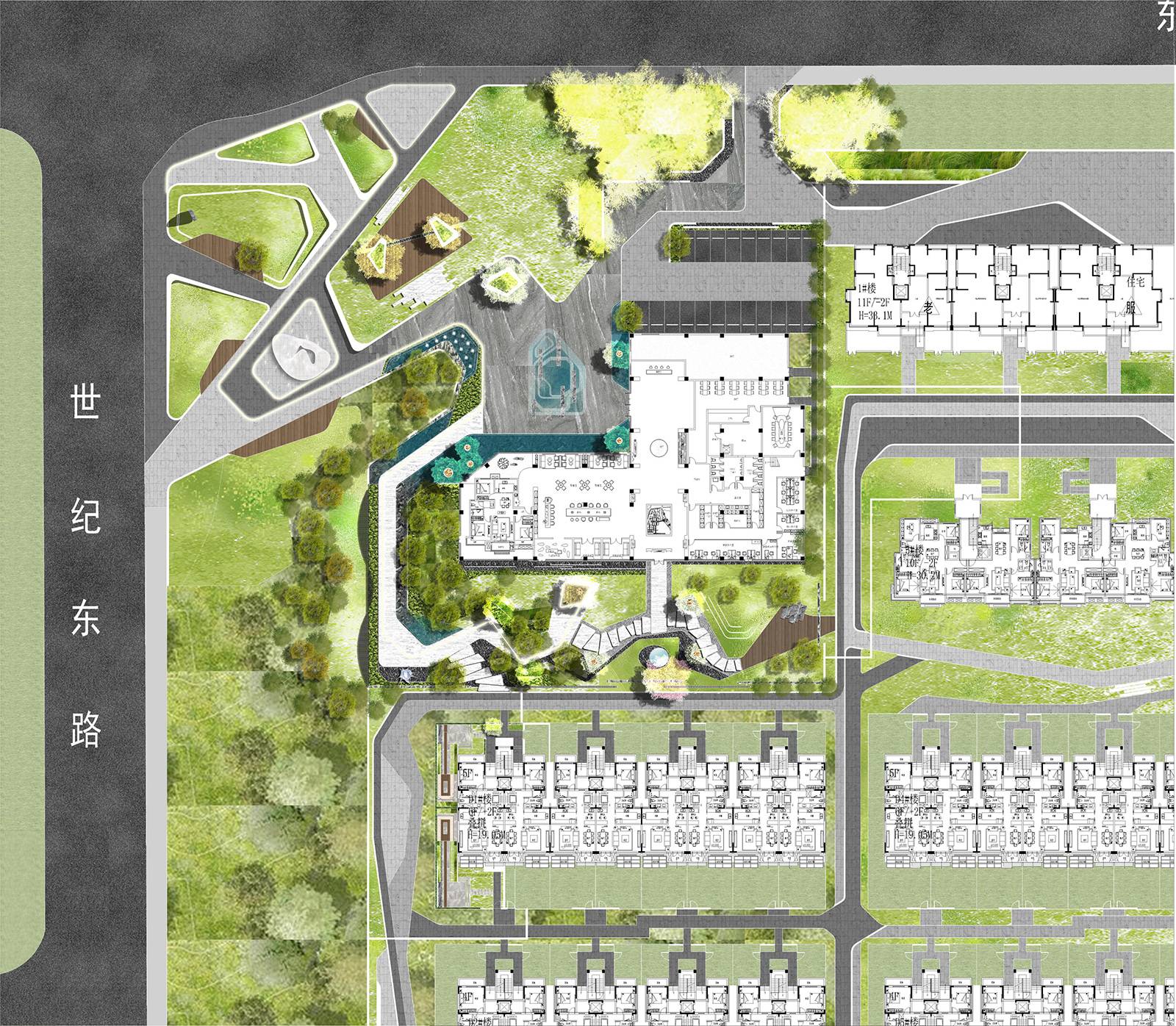 項(xiàng)目整個(gè)場(chǎng)地南高北低,西高東低,建筑作為場(chǎng)地中心,由東南向西北形成一個(gè)約1.5 米高差的緩坡,內(nèi)部將由商業(yè)內(nèi)街,高層住宅,別墅組成一個(gè)完整的私屬居住空間。設(shè)計(jì)時(shí)除了充分考慮各區(qū)域之間的獨(dú)立性和特性外,我們更注意公共空間的合理布局及不同區(qū)域的生活屬性,激發(fā)互動(dòng)的同時(shí),保證局部區(qū)域的幽靜、安寧。