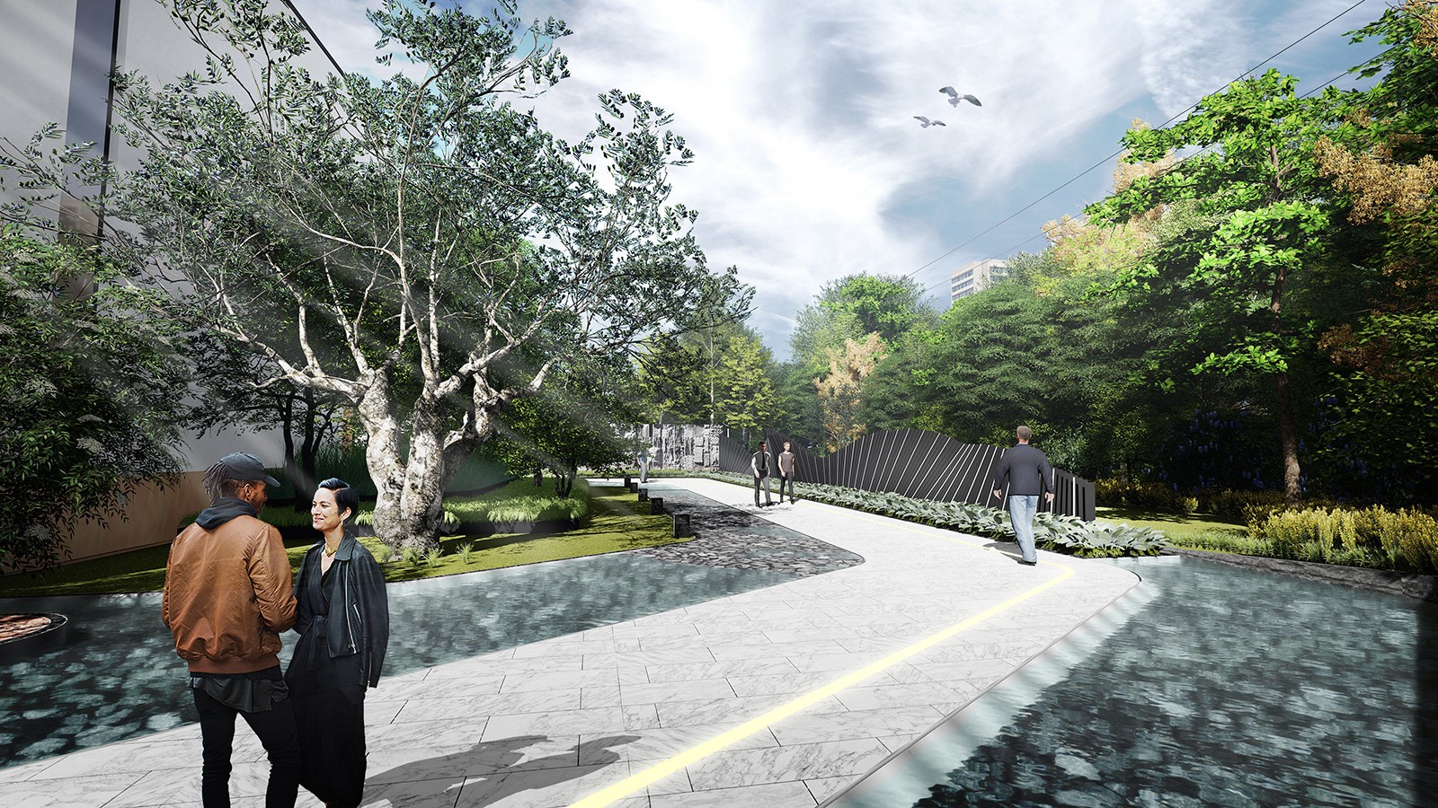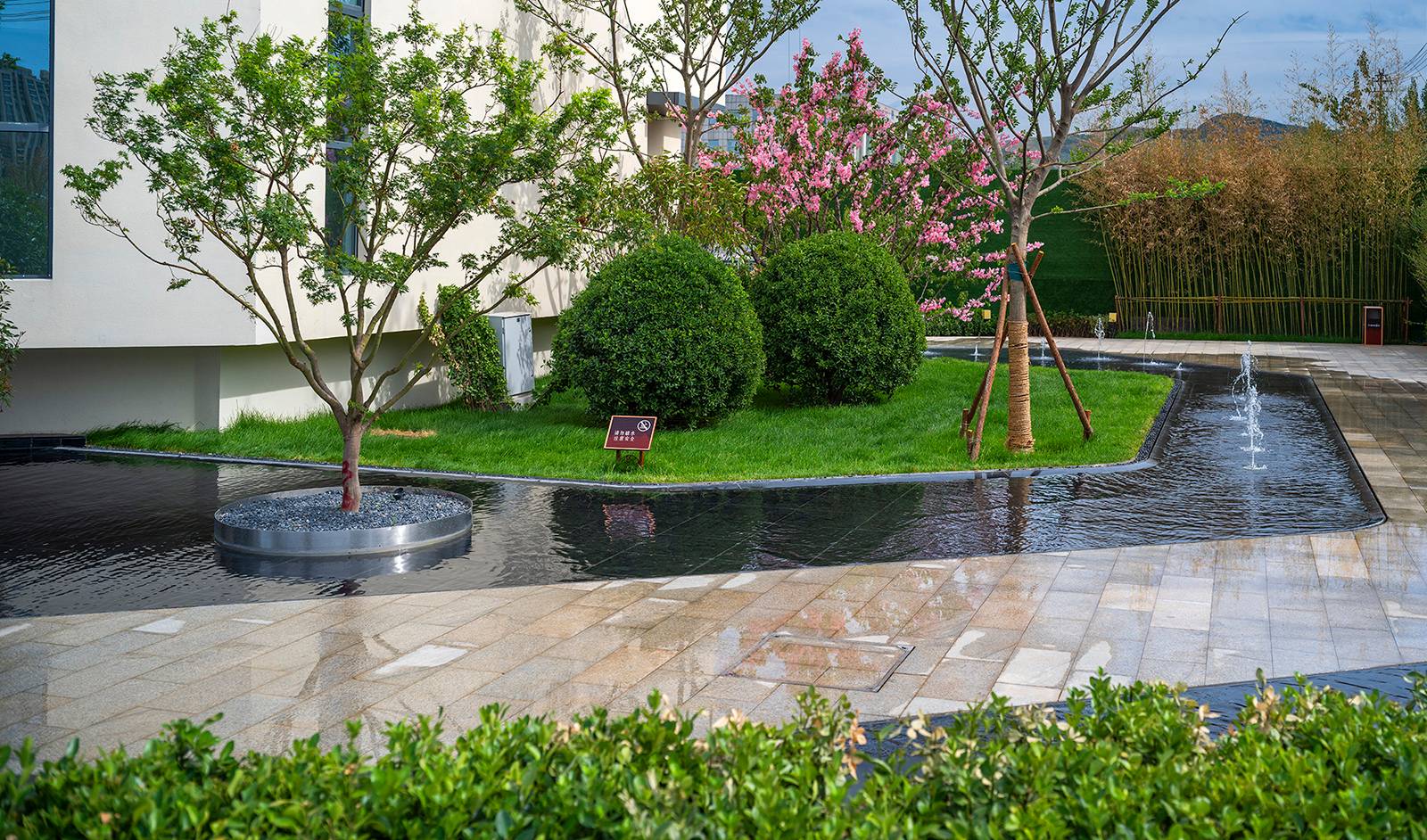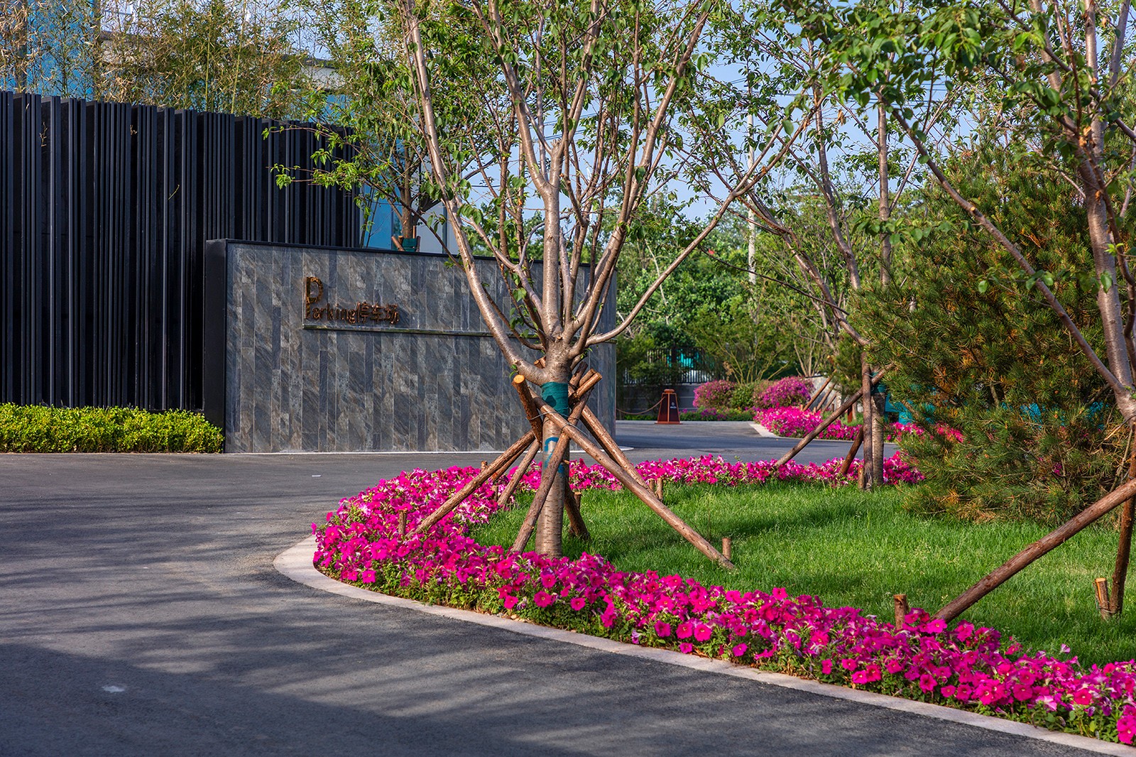 設(shè)計(jì)以場(chǎng)地關(guān)系為基準(zhǔn),借助建筑的布置形態(tài),在規(guī)整的建筑布局中,打造洄游式步行系統(tǒng),增加區(qū)域內(nèi)的人行流線通暢性,通過(guò)園路形狀、鋪裝線條設(shè)計(jì),綠化帶方向,形成具備引導(dǎo)性的景觀空間,強(qiáng)化線條概念。