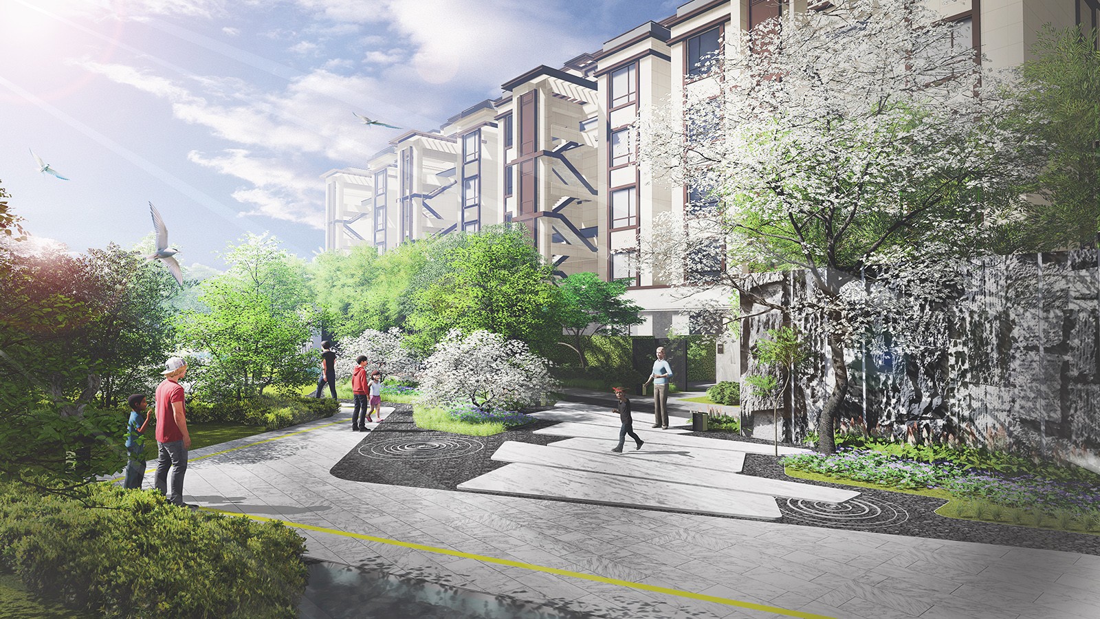 海信泮山大區(qū)的景觀設(shè)計(jì)延續(xù)展示區(qū)的理念進(jìn)一步深化,通過(guò)一條自由的折線串聯(lián)水之幕、光之廊、云之嶼三大景觀空間,形成了整個(gè)社區(qū)的中軸焦點(diǎn),林下空間、折線公園、漫步花園、木舞臺(tái)散布于社區(qū)之中,共同構(gòu)筑簡(jiǎn)約、現(xiàn)代、靈動(dòng)的居住景觀。精彩即將全面呈現(xiàn),敬請(qǐng)期待。