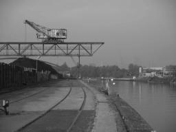 ▲改造后的奧芬巴赫港口,巨大的生銹鋼鐵結(jié)構(gòu)的塔式起重機佇立在港口