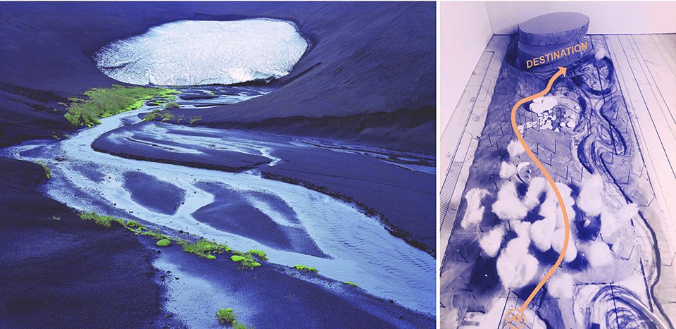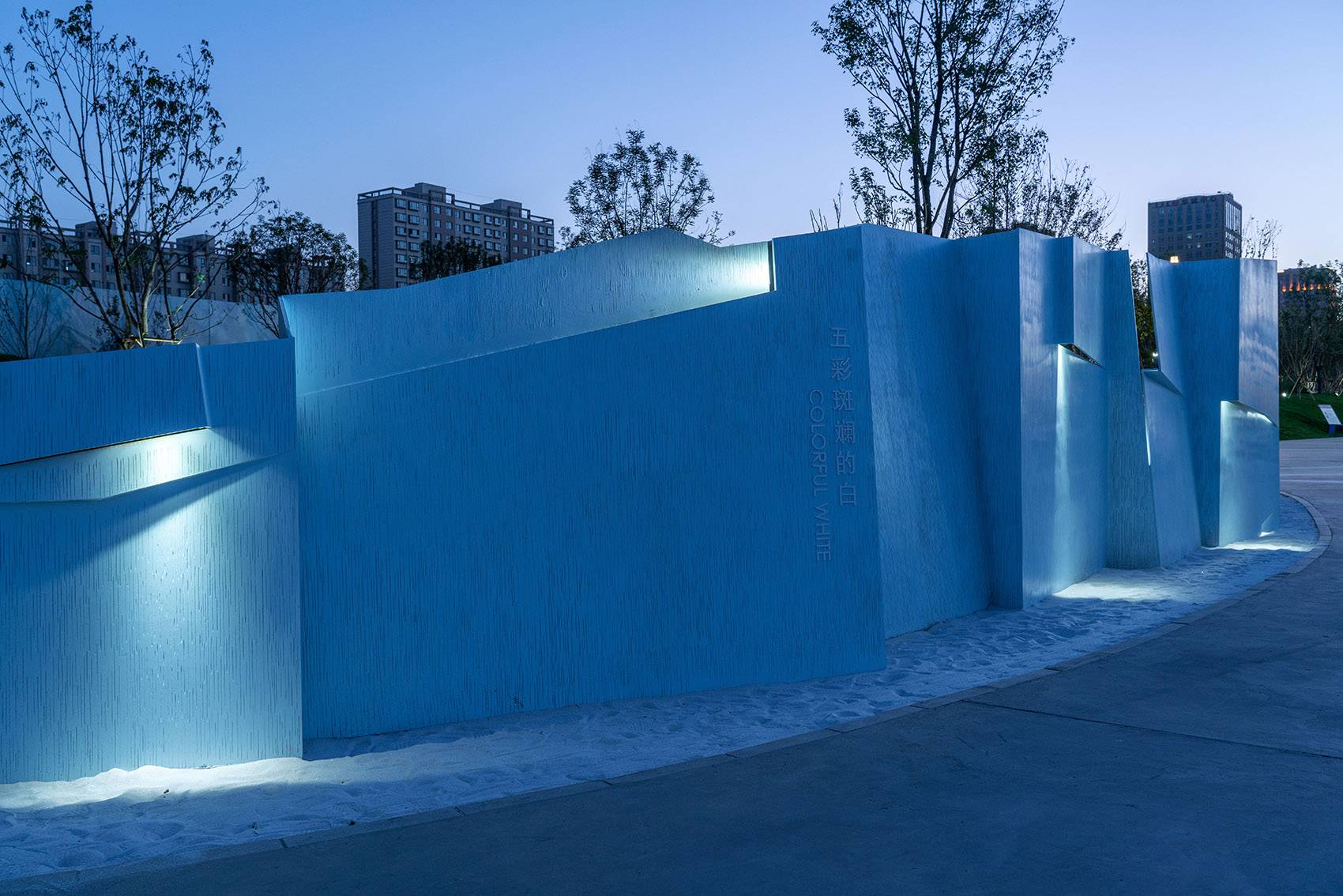 以雕塑感的草坡地形、綠意林帶和“藍冰”景墻作為背景,白天時分的大小冰山顯得格外晶瑩剔透,仿佛身處冰山內(nèi)部??纱┧筘炌ǖ脑O(shè)計結(jié)構(gòu)帶給慢慢走近的人們以驚喜感和探索欲。靈動交替閃爍的燈光在暮色中熠熠生輝。我們不希望它僅僅在入口靜態(tài)地矗立,而是通過動態(tài)的燈光設(shè)計和互動參與性的注入,從而讓這座冰山”活”起來。