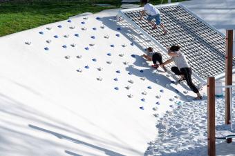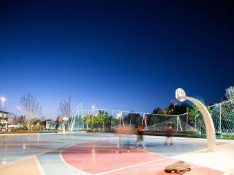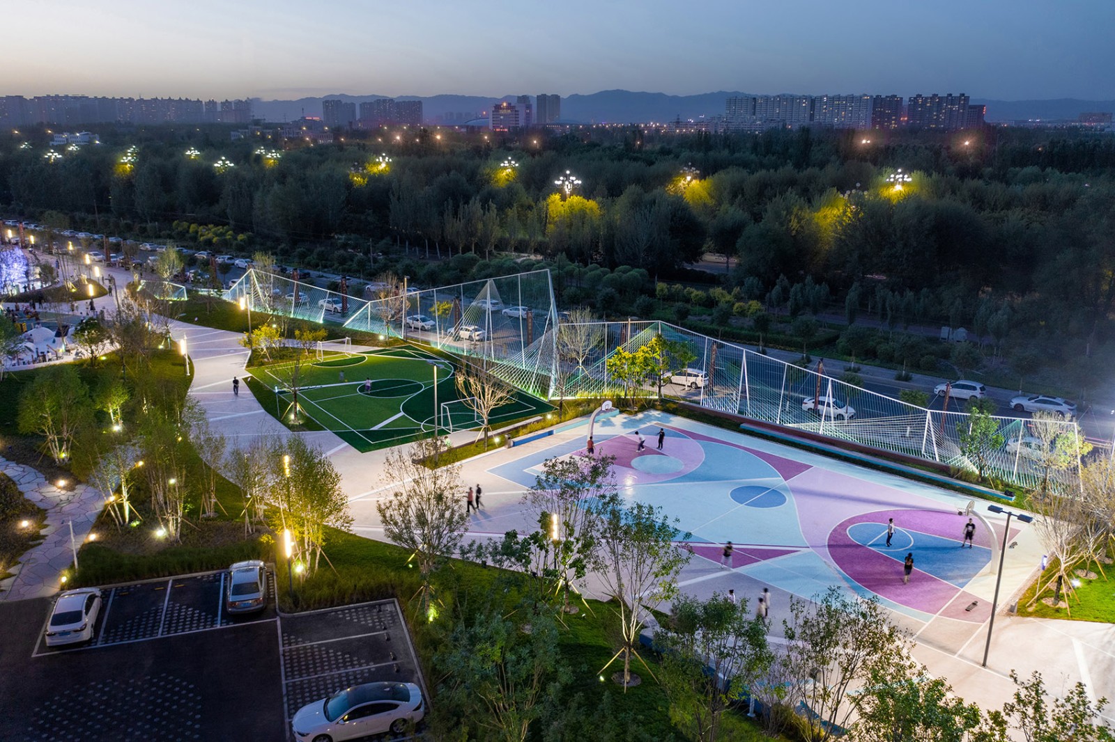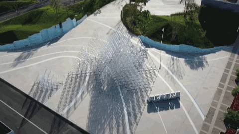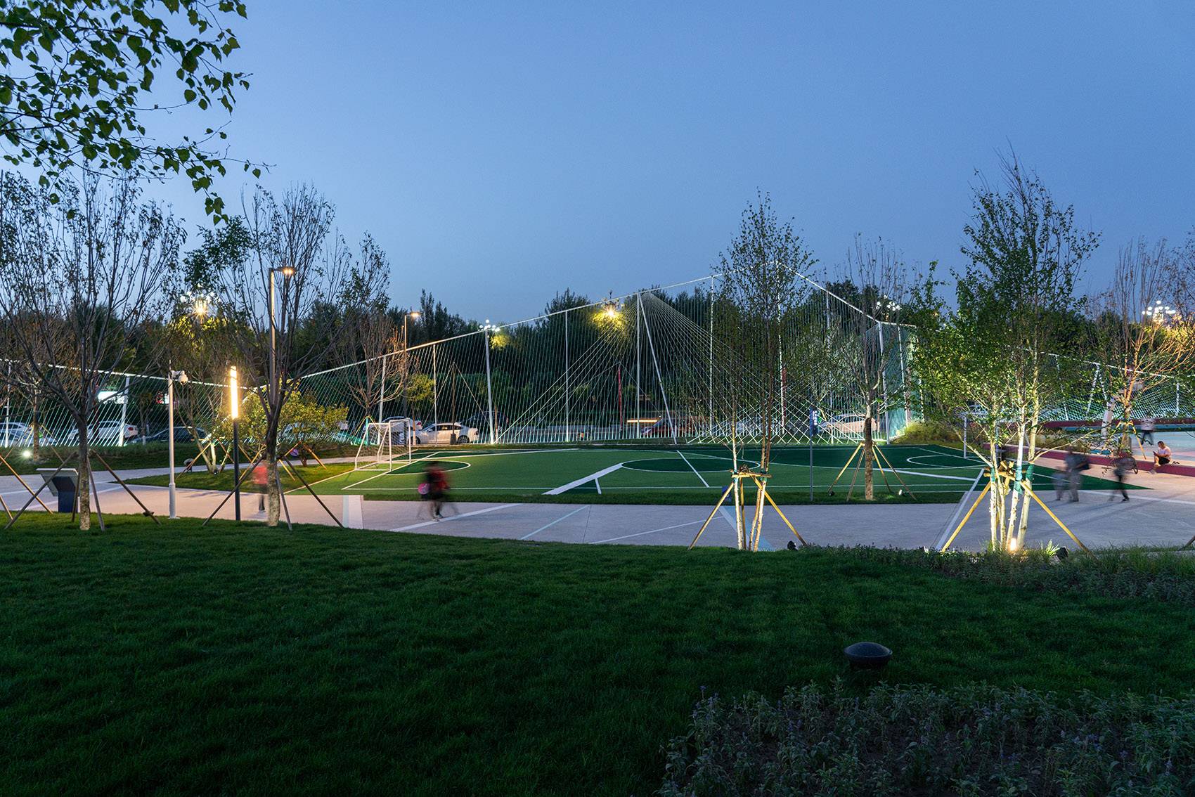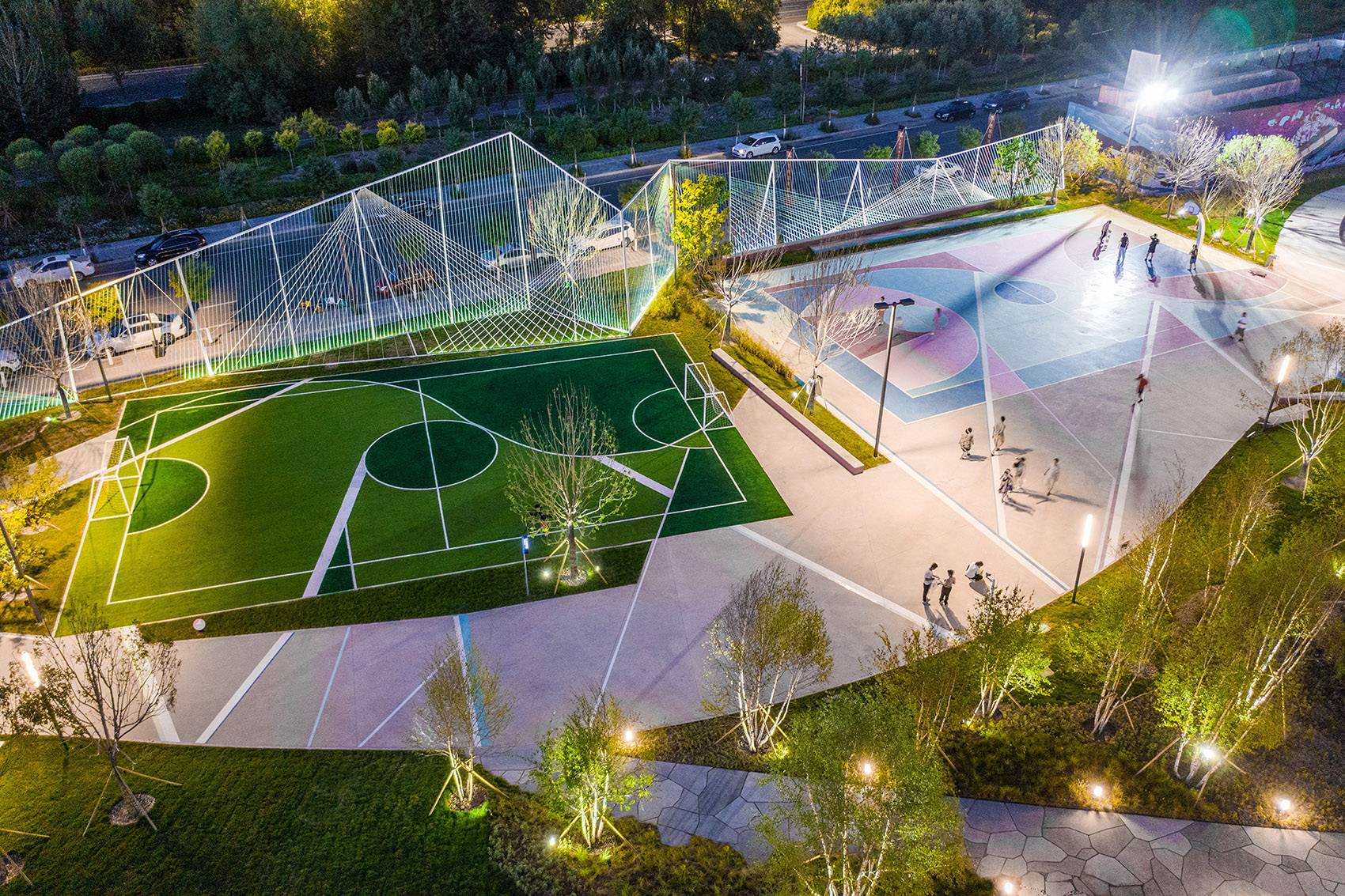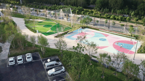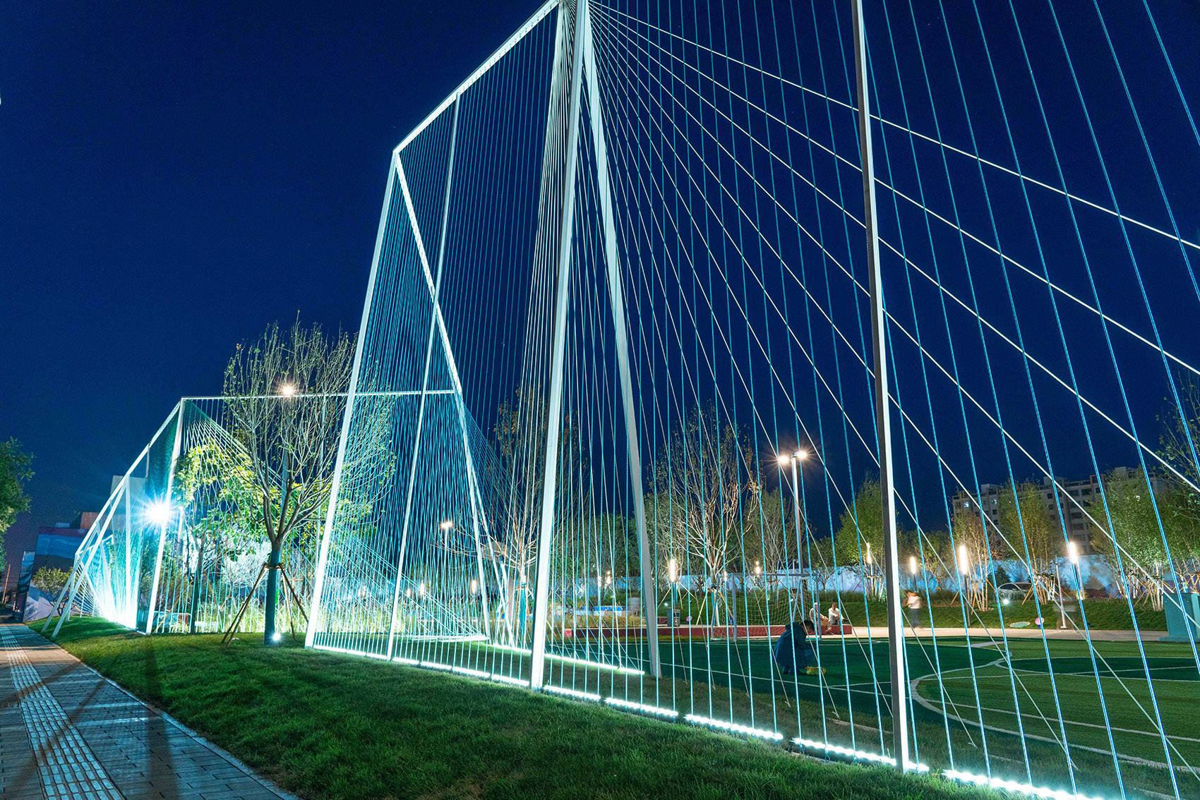 繽紛的球場地面噴涂和藝術(shù)造型感的球架,營造出一種自由奔放街頭氣質(zhì)。這段模擬冰山天際線、最高處10M、由近4800M藍色系尼龍繩打造而成的通透“邊界”,不僅承載著對外快速主干路的城市形象界面展示,同時也承擔(dān)著公園內(nèi)部球類運動的安全圍擋。