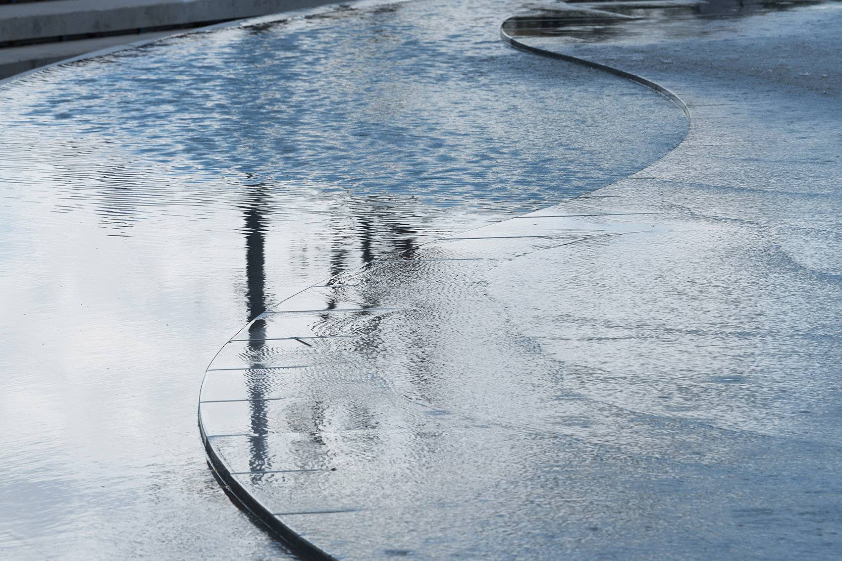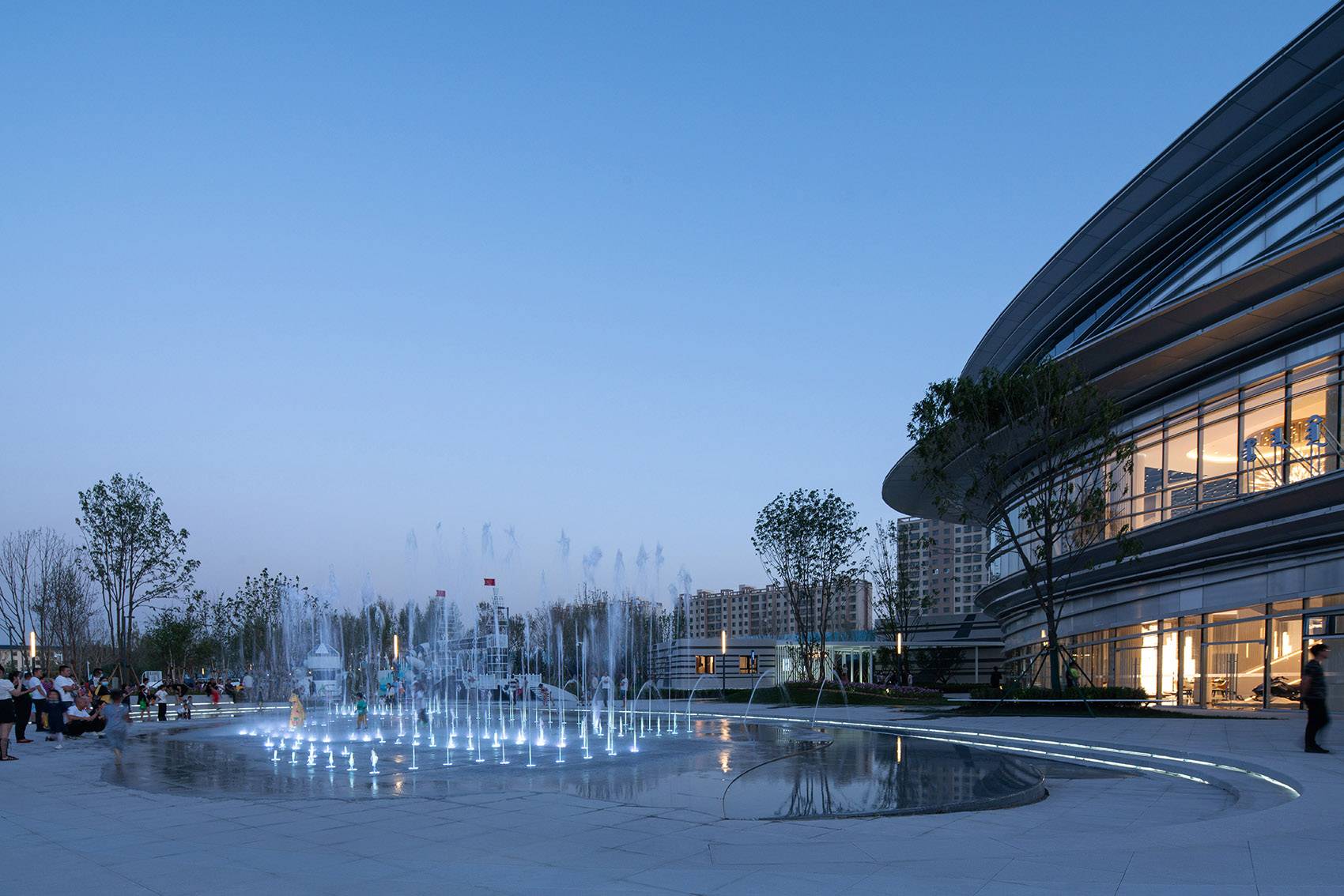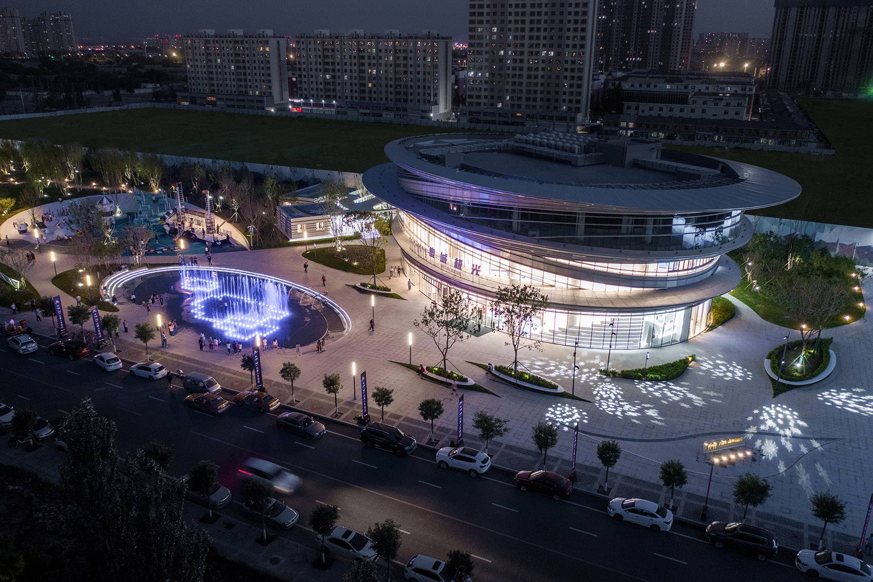 設(shè)計通過對廣場地平面的半環(huán)形“藝術(shù)雕刻”,結(jié)合數(shù)控編程的音樂旱噴舞臺、水下銀河星光燈、林蔭下的層疊座階看臺和下沉通道側(cè)壁緩緩落下的跌水,形成了一處可坐、可看、可玩的水廣場;而當(dāng)場地沒有水的時候,它也可以作為戶外策展彈性使用的集聚活動場所。
