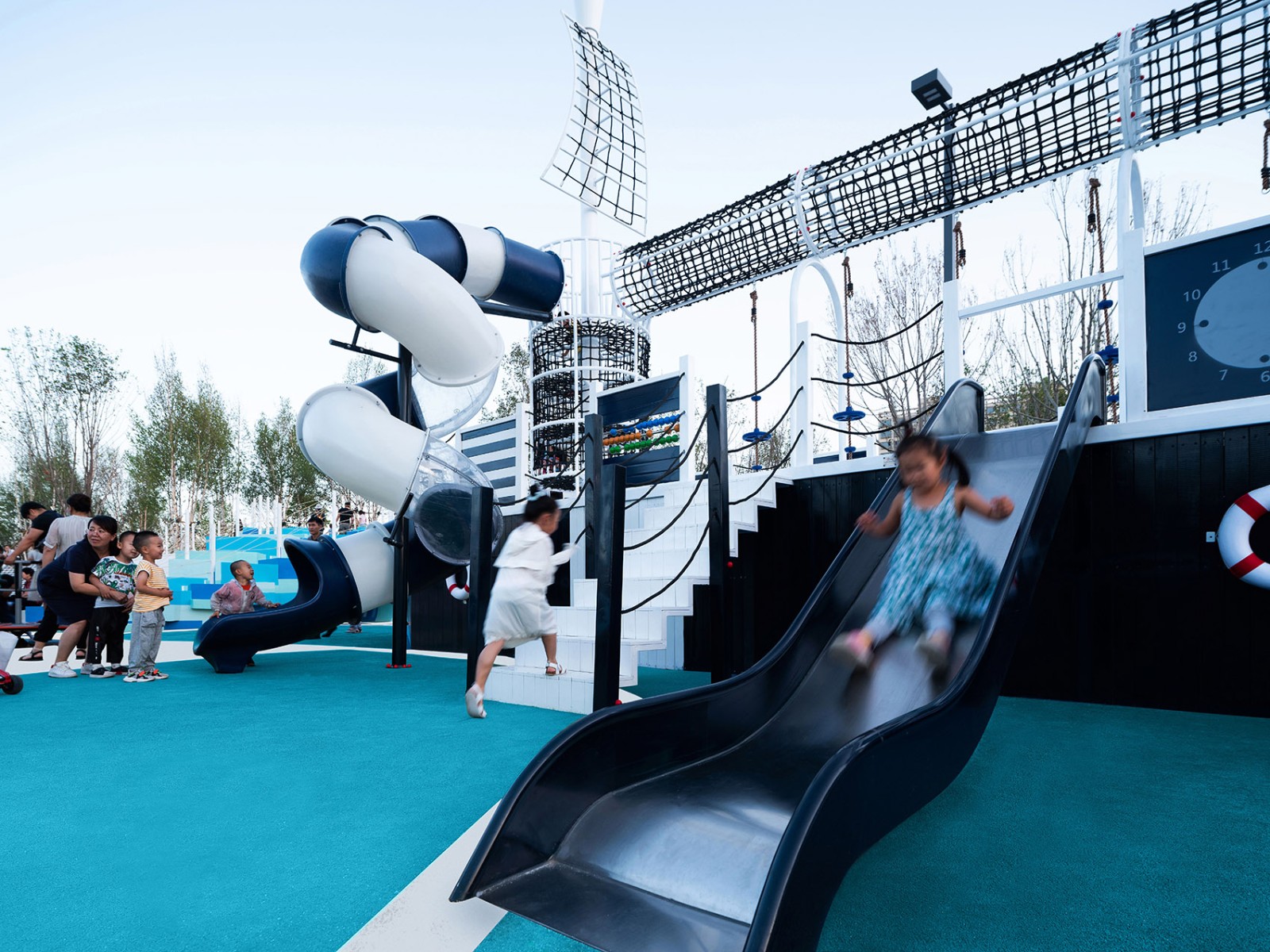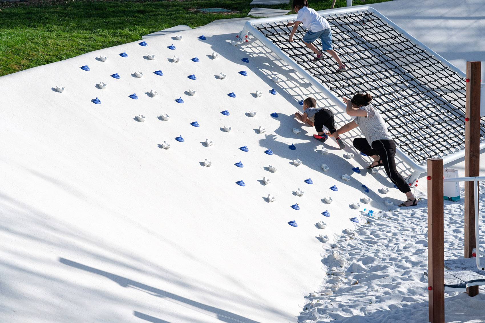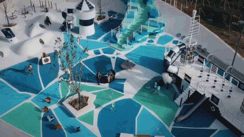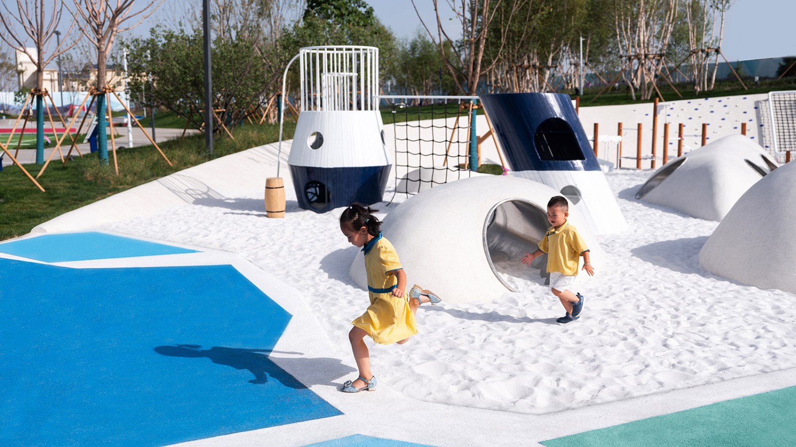 我們在這里模擬了一艘??吭诟”械木薮笃票瓶即?、白沙灘岸邊照亮四周的燈塔、可藏和鉆的極地洞穴群、拾級而上的“冰巖橋”、沙灘里的玩沙游具和坡地上的冰雪攀巖…共同為孩子們營造了一場關(guān)于探索冰雪極地風(fēng)貌的科考旅程和玩樂體驗。在這個冰意十足的破冰樂園里,我們希望景是酷爽的,人是鼎沸的。