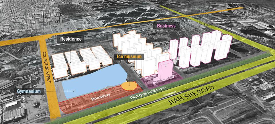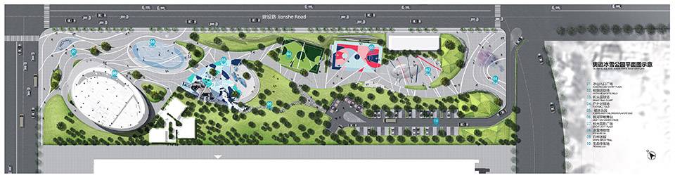 項目位于包頭市新都市區(qū),占地約20,000m2,緊鄰串聯(lián)東西新老城區(qū)的城市主軸建設(shè)路,與包頭市政府僅一街之隔,計劃未來兩至三年內(nèi)將在基地以南打造呼包鄂最大的室內(nèi)冰雪館。通過和業(yè)主的若干輪溝通,冰雪和戶外運動不出意外地成為這個帶狀公園的主基調(diào)。然而面對這樣一個正對近百米寬的城市快速路和平整細長的場地,如何規(guī)劃內(nèi)外交通和功能布局,對外展示界面形象特色,同時在節(jié)點上強化冰雪概念,以創(chuàng)造出所有參與者對于項目的歸屬感便成為我們整體重點考慮的目標(biāo)。