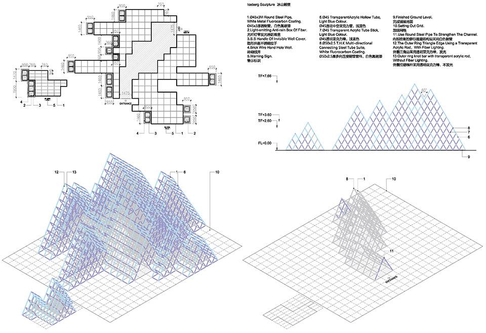大小冰山拼裝調(diào)試過程,對于結(jié)構(gòu)、材料和工藝的反復(fù)打磨實驗和施工現(xiàn)場不斷的調(diào)試復(fù)核。“藍冰”景墻的日和夜。讓大小冰山雕塑閃爍的夜景效果成為入口廣場的主景,“藍冰”景墻發(fā)光方式和照度相對克制,僅作為整體環(huán)境的暈染托底。