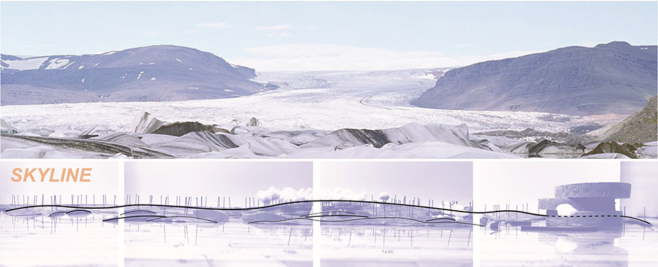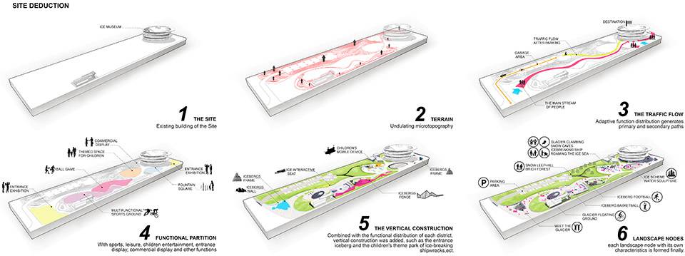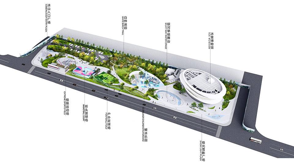 地形的塑造將使場地更加立體,豐富主次動線行進體驗的同時,也提供給初入場地的人們一個透過白樺林俯瞰全景的“眺望臺”。在功能設(shè)置上,極限運動場、籃球場和小型足球場的靈活布局可強化公園戶外運動的全域概念。而面向聚攬人氣的親子客群,設(shè)計考慮在毗鄰冰雪博物館側(cè)融合隆起的地形中嵌入一處約800m2的“半谷地”,打造一個主題為極地科考的兒童活動區(qū)。在公園的主入口,設(shè)計構(gòu)想了一座極具冰雪特色、同時結(jié)合參與性的主題雕塑,以增強場地的吸引力和昭示性。