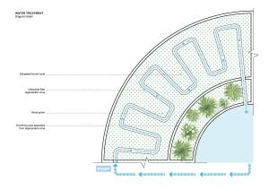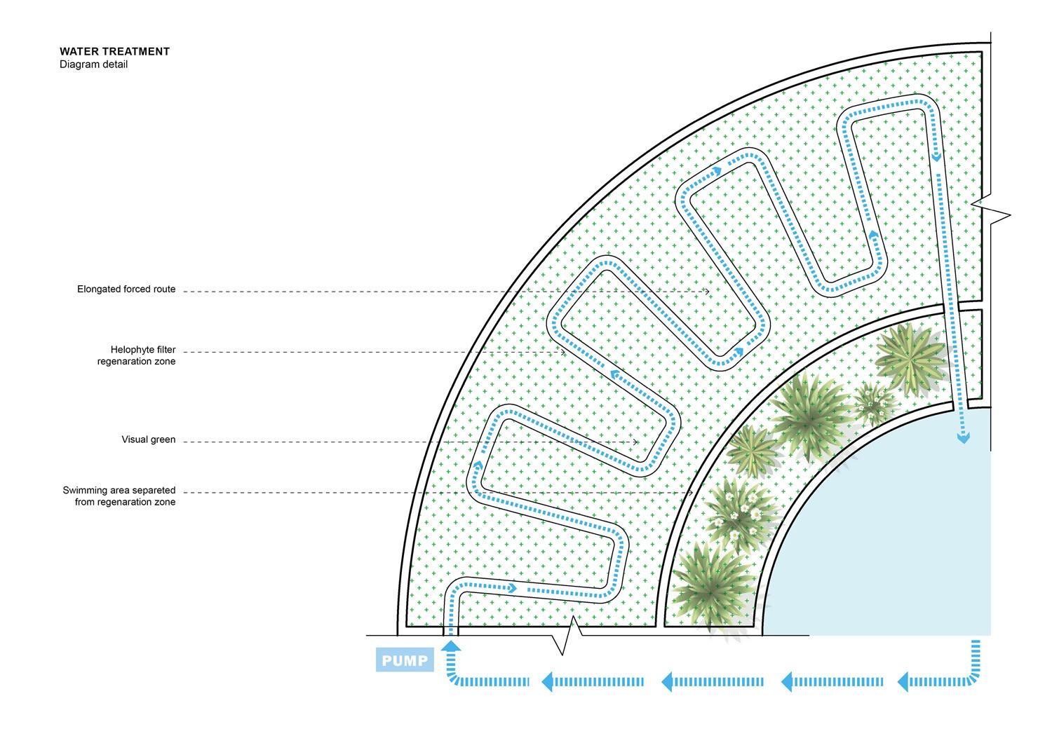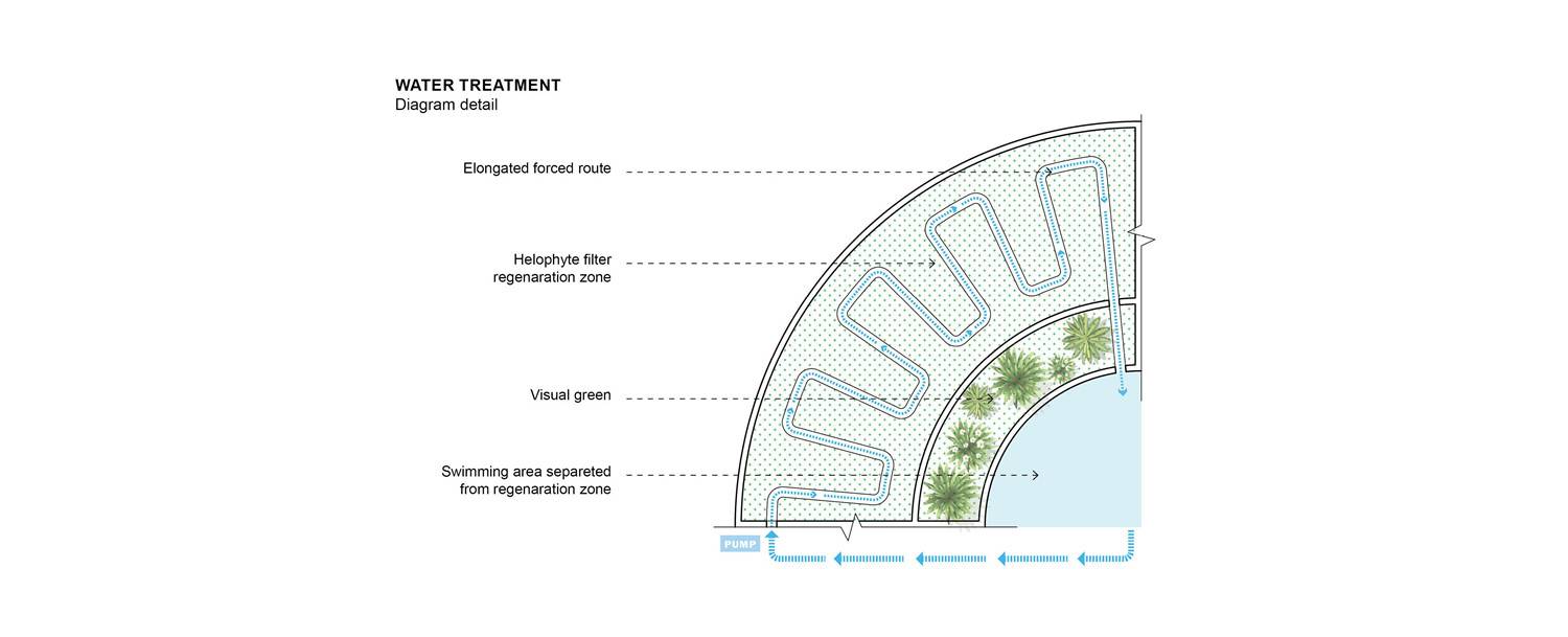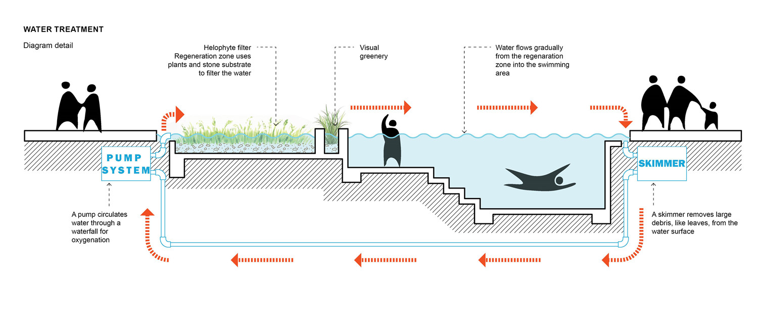 所有的游泳池都是以一種可持續(xù)的方式設計的,通過在游泳池周圍種植蘆葦?shù)恼由参镞^濾系統(tǒng)自然清潔其水。凈化水的處理是由生長在蘆葦根中的細菌天然完成的。