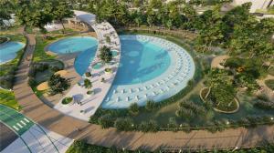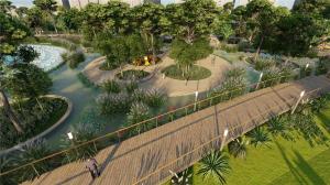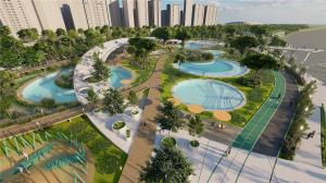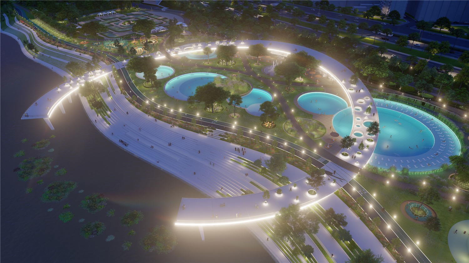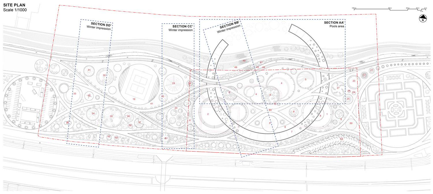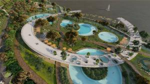 The proposal unifies the pool complex with the surrounding cultural facilities. On the West, the Sagak Sagak Artistic Area, and on the East, the Botanical Learning Center. The plan connects those 3 facilities through a system of meandering interweaved pedestrian paths, allowing easy pedestrian accessibility between all of them, transforming the entire riverfront into a prominent public natural destination.