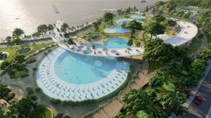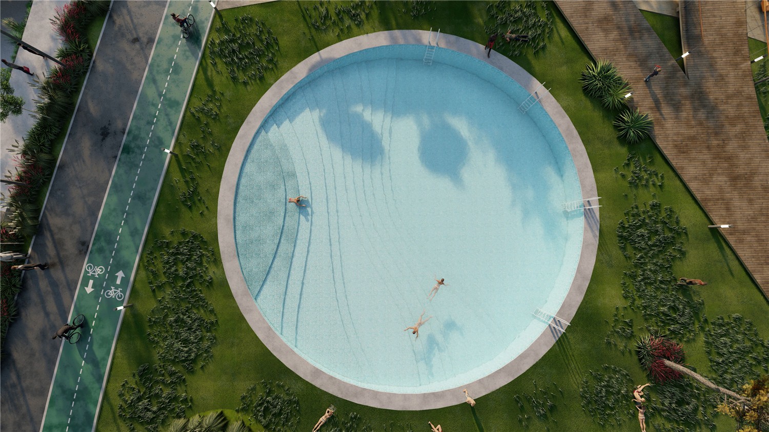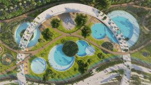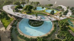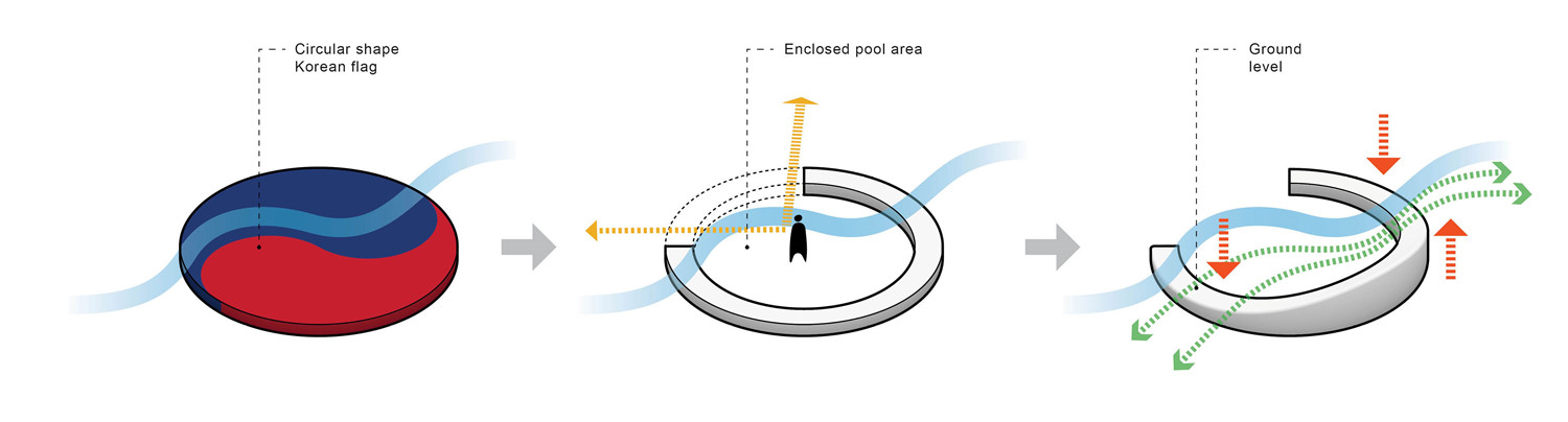 The search for this balance between nature & architecture, is the core of our design, translating the Taegeuk into a circular architectural object, a pedestrian walkway that encloses the main pool facility. This circular walkway is interrupted at the riverbank, hovering over the river, a belvedere allowing amazing views over the Hang River.