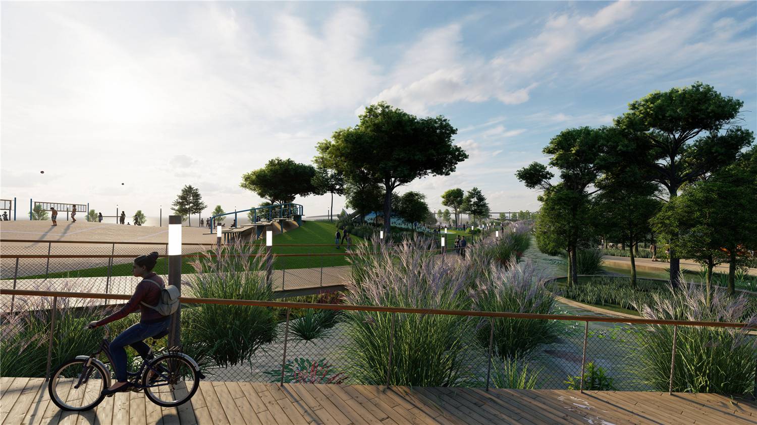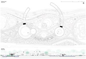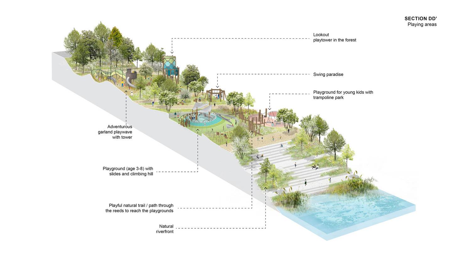 The undulating intertwined pedestrian paths create opportunities and affordances for the park’s public program. Programmatic interventions for entertainment and leisure spaces within the natural environment are envisioned, offering valuable interactions with nature. Spaces for practicing a wide range of sports, resting areas, shading structures and natural kids playscapes, resulting in a multifunctional park suitable for all kind of ages.
