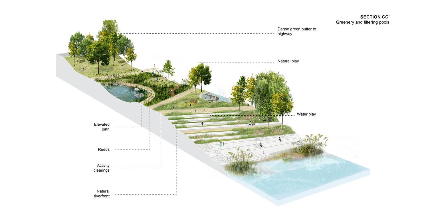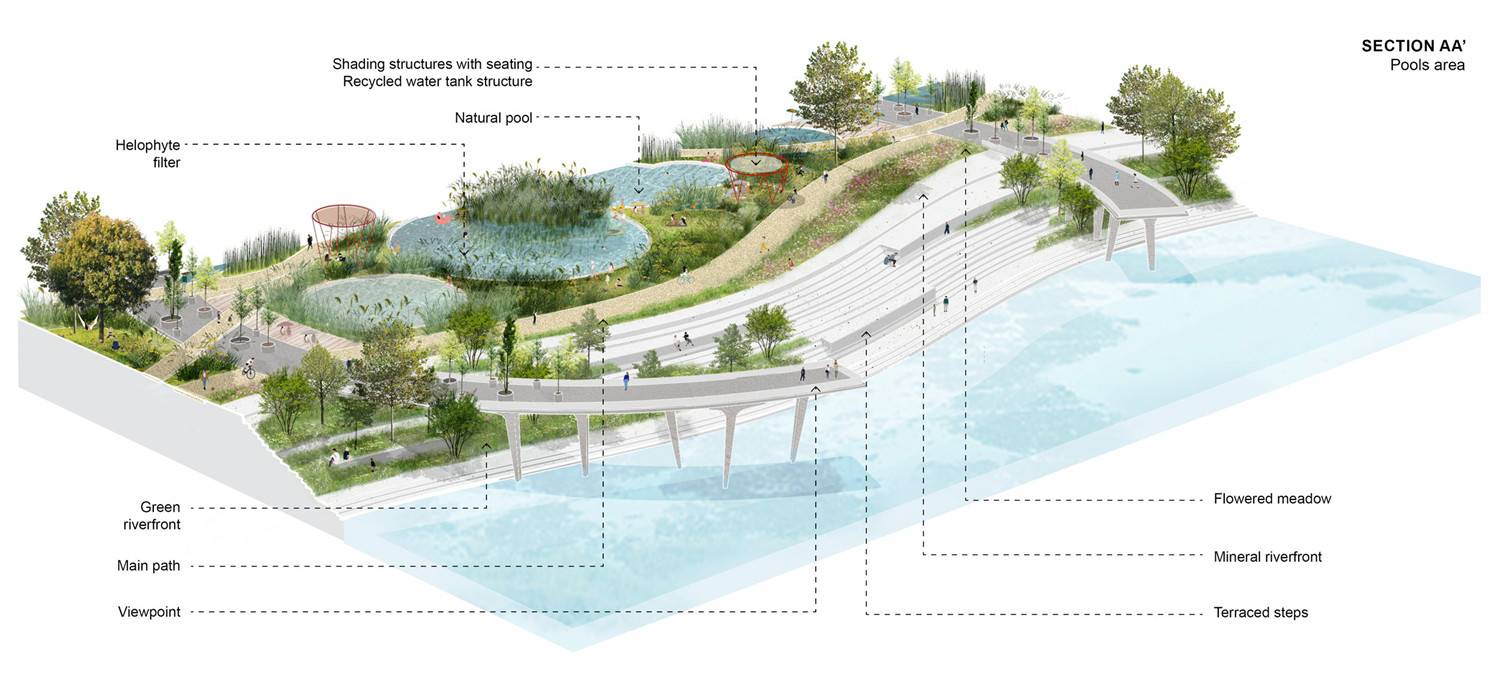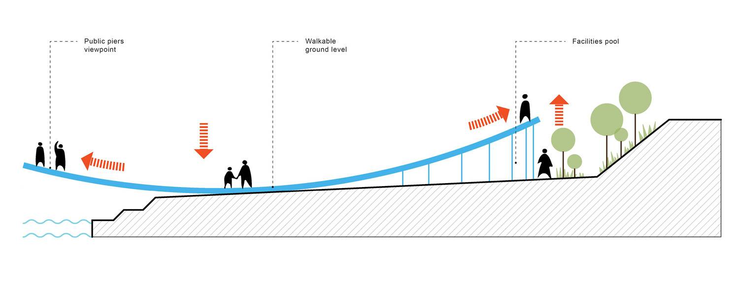 向上彎曲的道路上,高架的人行步道隔絕了游泳池旁的高架橋噪音,同時在環(huán)布道下容納必要的室內(nèi)設施。它在與濱河長廊的交叉處變平,以方便行人穿行;最后,道路伸出河岸部分形成了兩個可步行的碼頭,可以俯瞰河流和恢復的河岸自然感。
