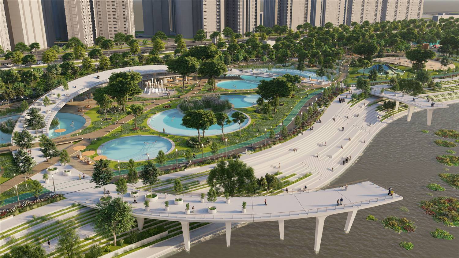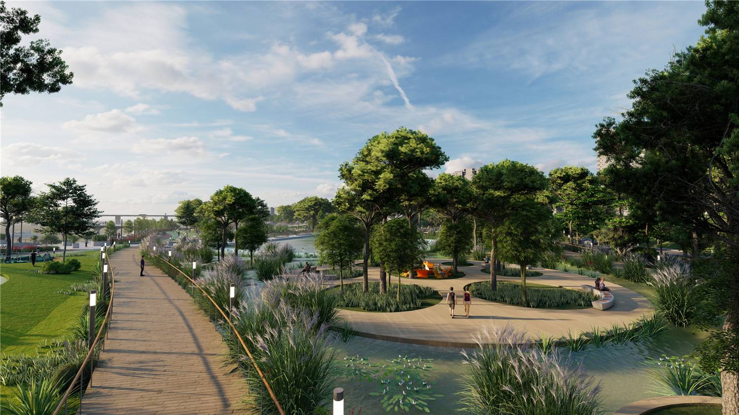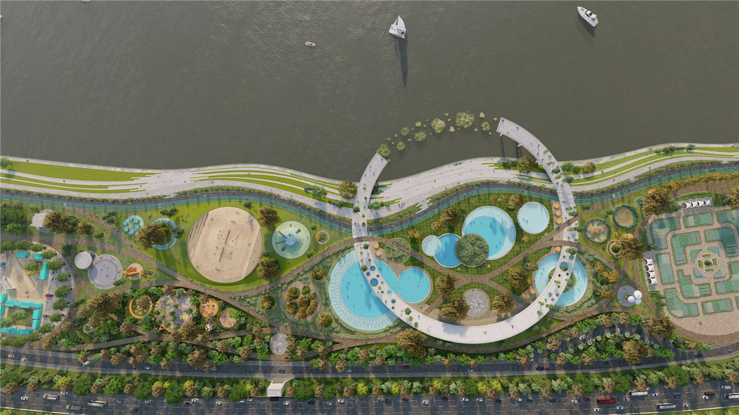 向上彎曲的道路上,高架的人行步道隔絕了游泳池旁的高架橋噪音,同時在環(huán)布道下容納必要的室內(nèi)設施。它在與濱河長廊的交叉處變平,以方便行人穿行;最后,道路伸出河岸部分形成了兩個可步行的碼頭,可以俯瞰河流和恢復的河岸自然感。