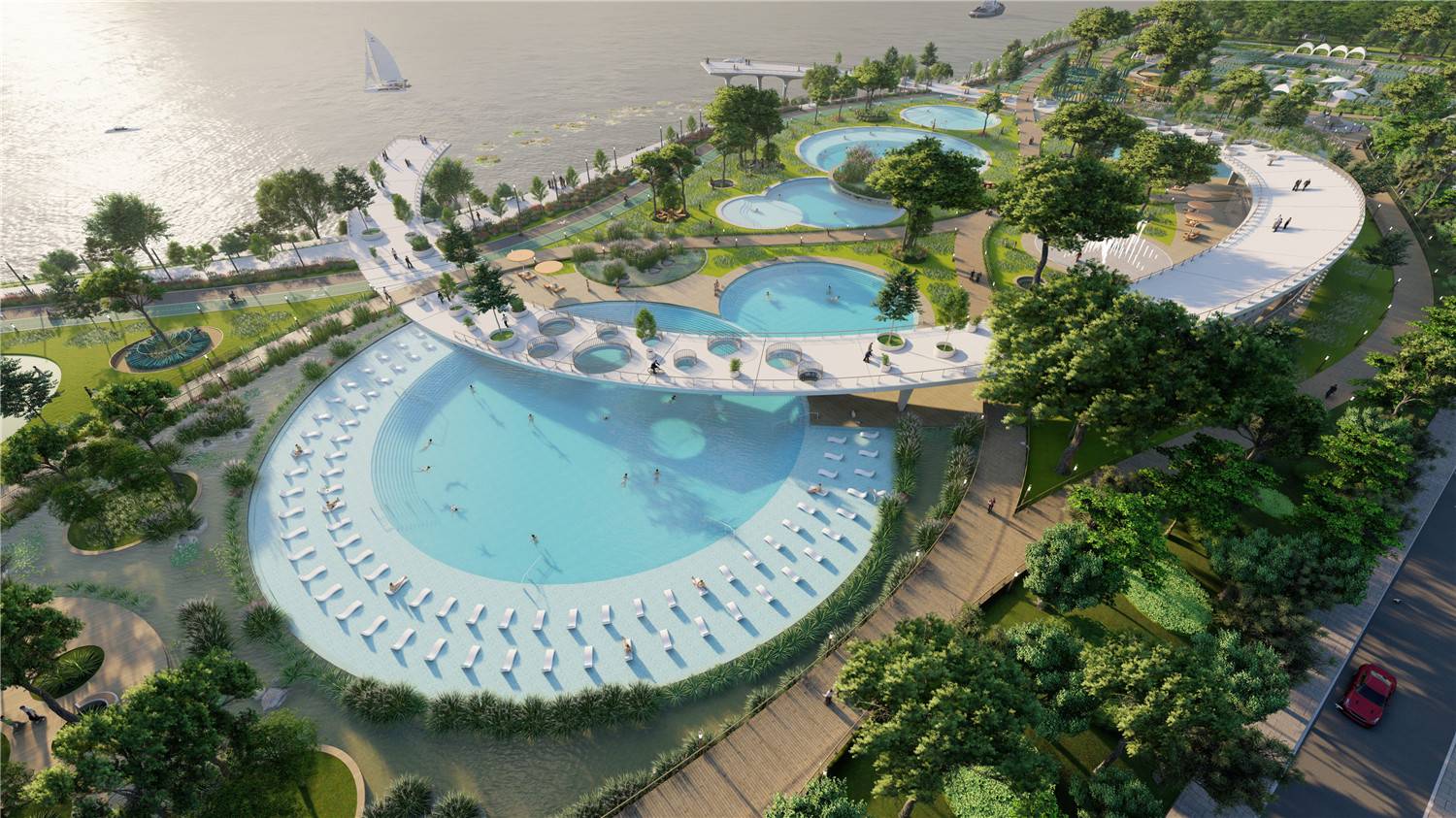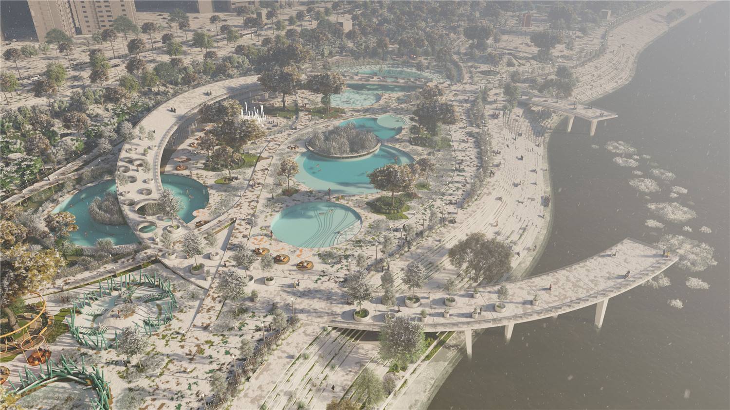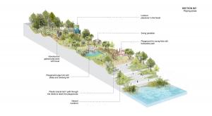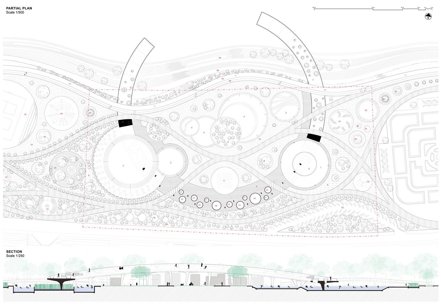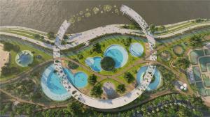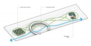 該提案將游泳池綜合體與周圍的文化設施結(jié)合到起來。因其西靠SagakSagak藝術(shù)區(qū),東鄰植物學習中心,該方案通過蜿蜒交織的步行道將這三個設施連接起來,使行人都能方便地通行所有設施之間,將整個河岸轉(zhuǎn)化為一個突出的“自然驛站”。