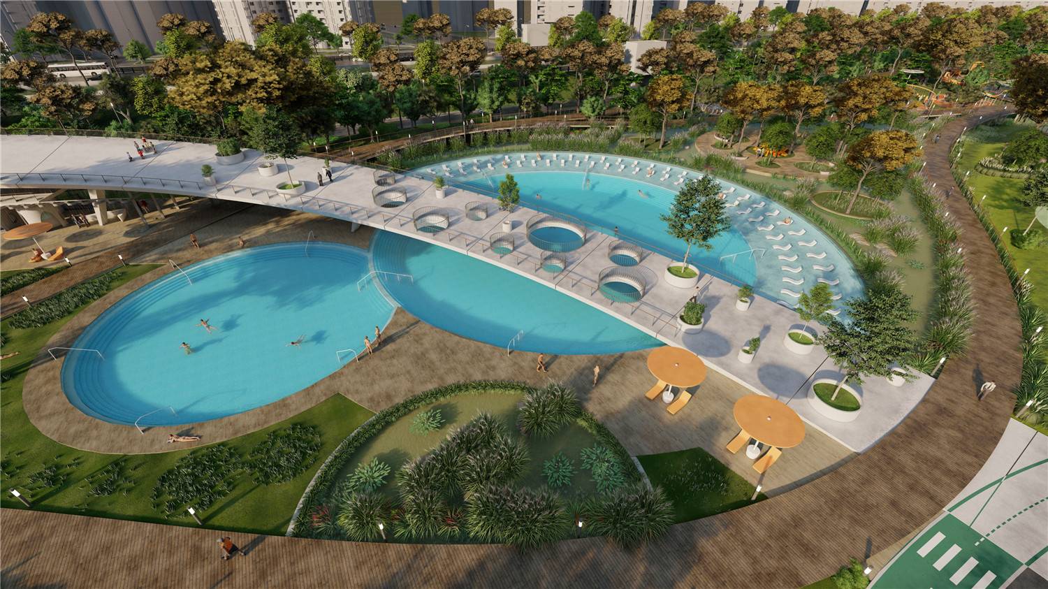 Curving upwards towards the highway, the elevated pedestrian walkway shields the pools from the traffic noise, and accommodates necessary indoor facilities under its roof at the same time. It flattens at the intersection with the riverfront promenade, in order to ease pedestrian connectivity; and finally, it protrudes over the riverbank, creating two walkable piers overlooking both, the river and the restored nature of the riverbank.