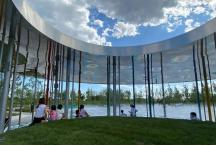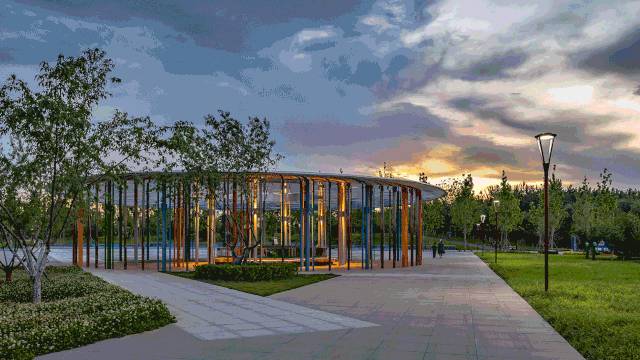 鏡面亭位于涉水廣場(chǎng)東北側(cè),在平面上,位置與水景相交。園亭包括圓鋼管立柱組合及其上支撐的圓形亭頂。光影交融變幻的鏡面亭與涉水廣場(chǎng),形成了黑橋公園一道亮麗的風(fēng)景線,讓游人流連忘返。