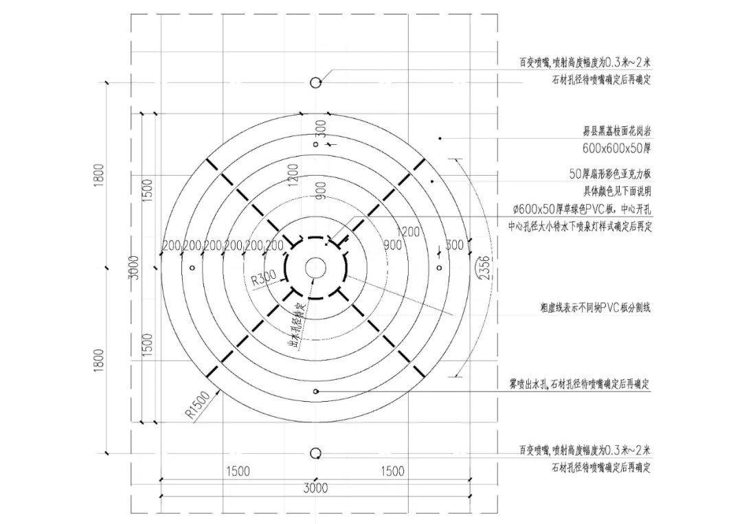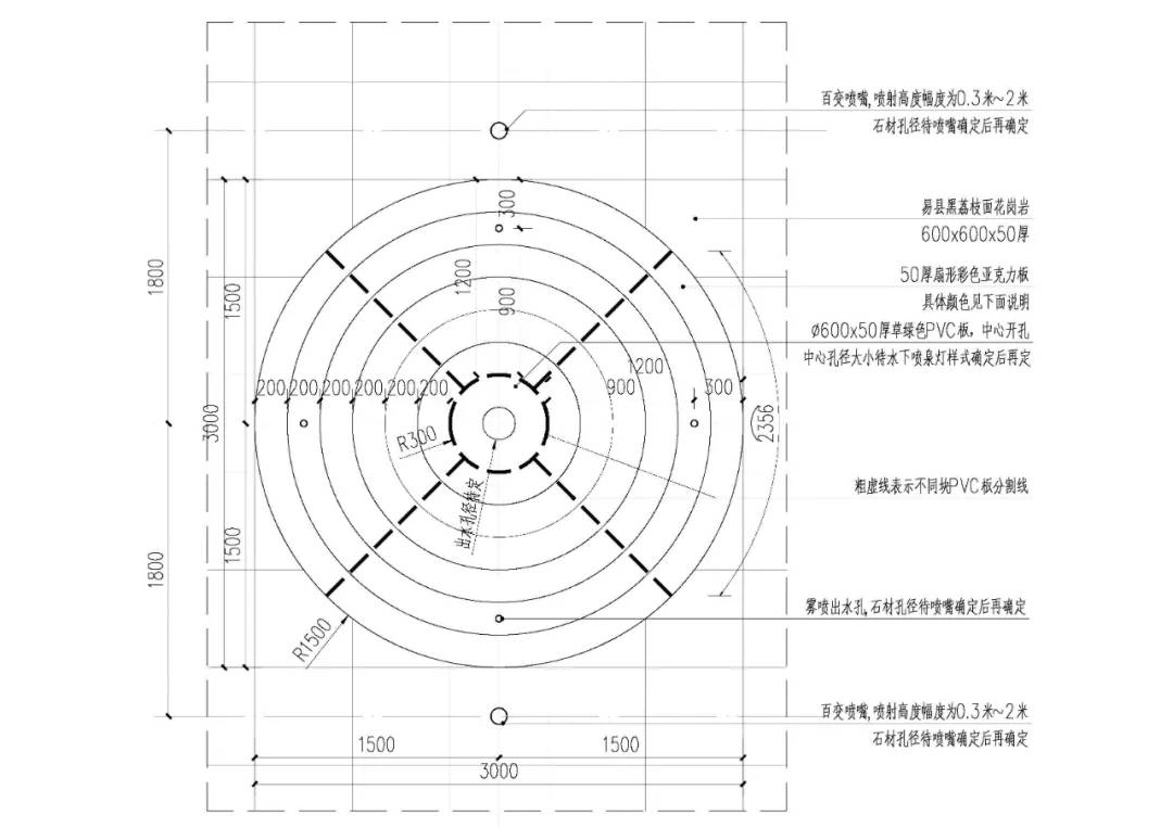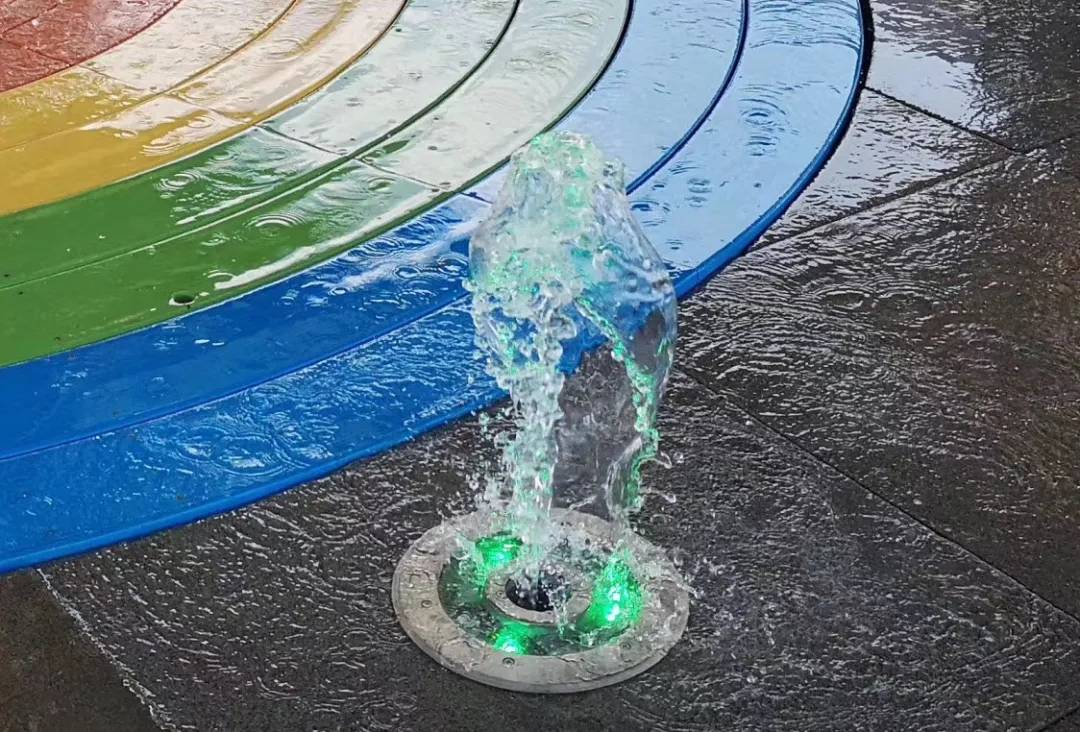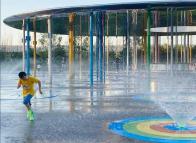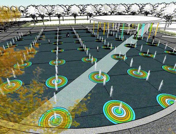 涉水區(qū)共有43個(gè)完整的出水點(diǎn)。以出水點(diǎn)為中心,鋪裝采用圓形彩色PVC蓋板。顏色自外圈開始向內(nèi)藍(lán)色-草綠色-中黃色-紅色-藍(lán)色,在地面展現(xiàn)出層層彩色漣漪的效果。