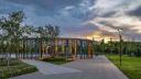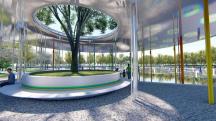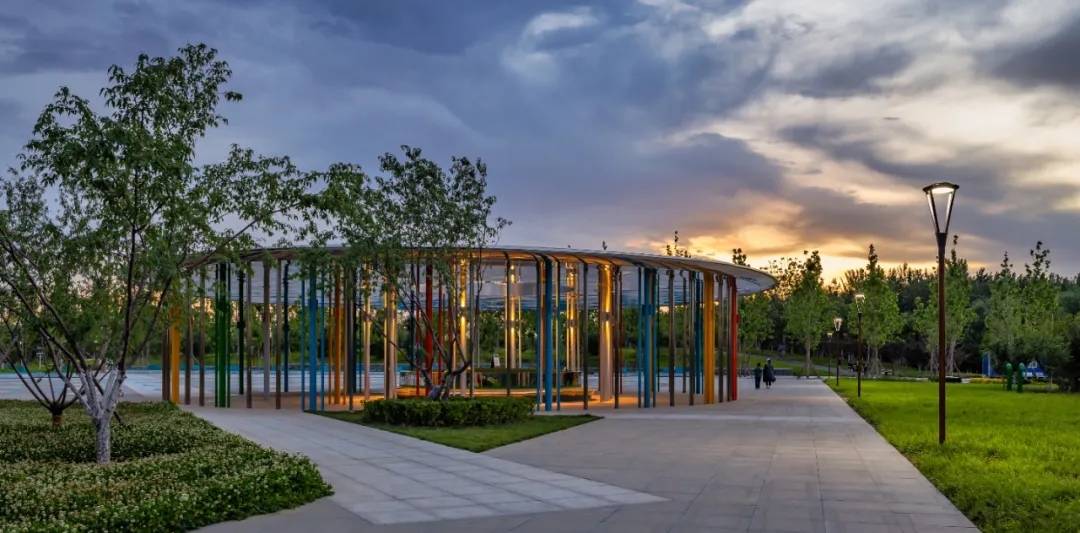 彩虹廣場(chǎng)由鏡面亭、涉水池、L型樹陣等組成。一條3米寬斜向白色道路打破規(guī)整的鋪裝形式,將樹陣、涉水鋪裝、鏡面亭串聯(lián)。