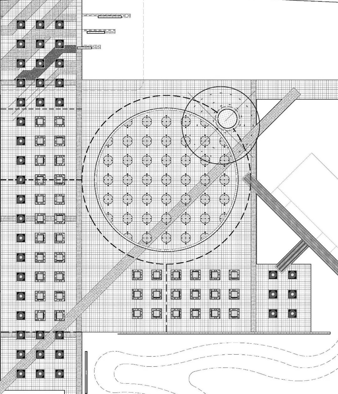 圓形涉水池直徑43.2米,面積1465㎡??蓪?shí)現(xiàn)皮膚般的鏡面水形式,朦朧奇幻的冷霧形式和變化豐富的音樂(lè)水柱形式。