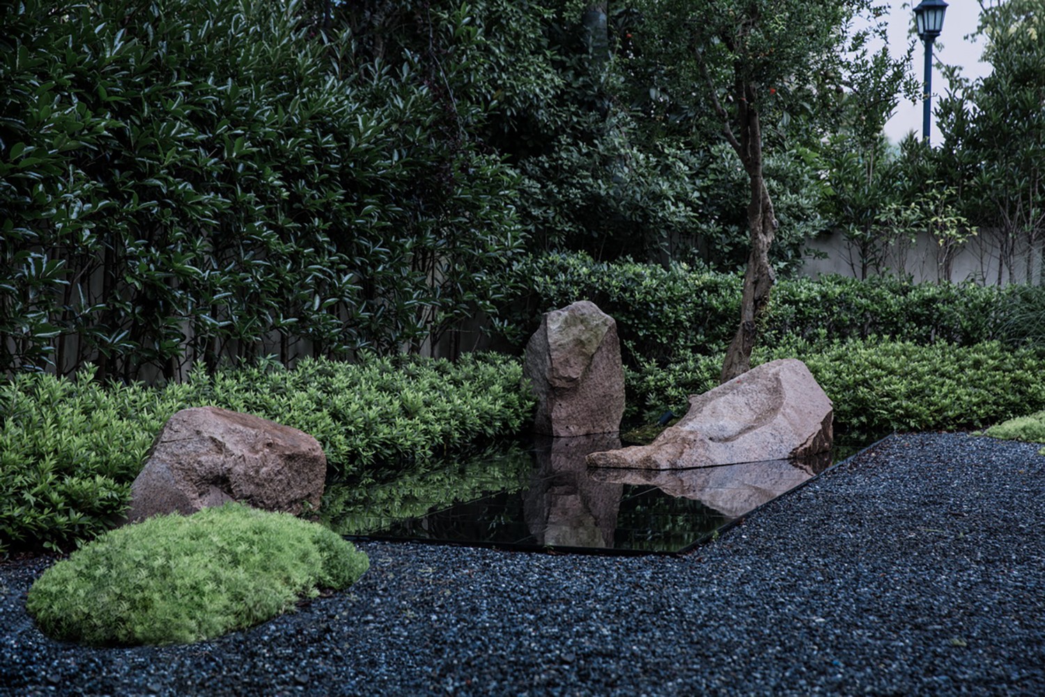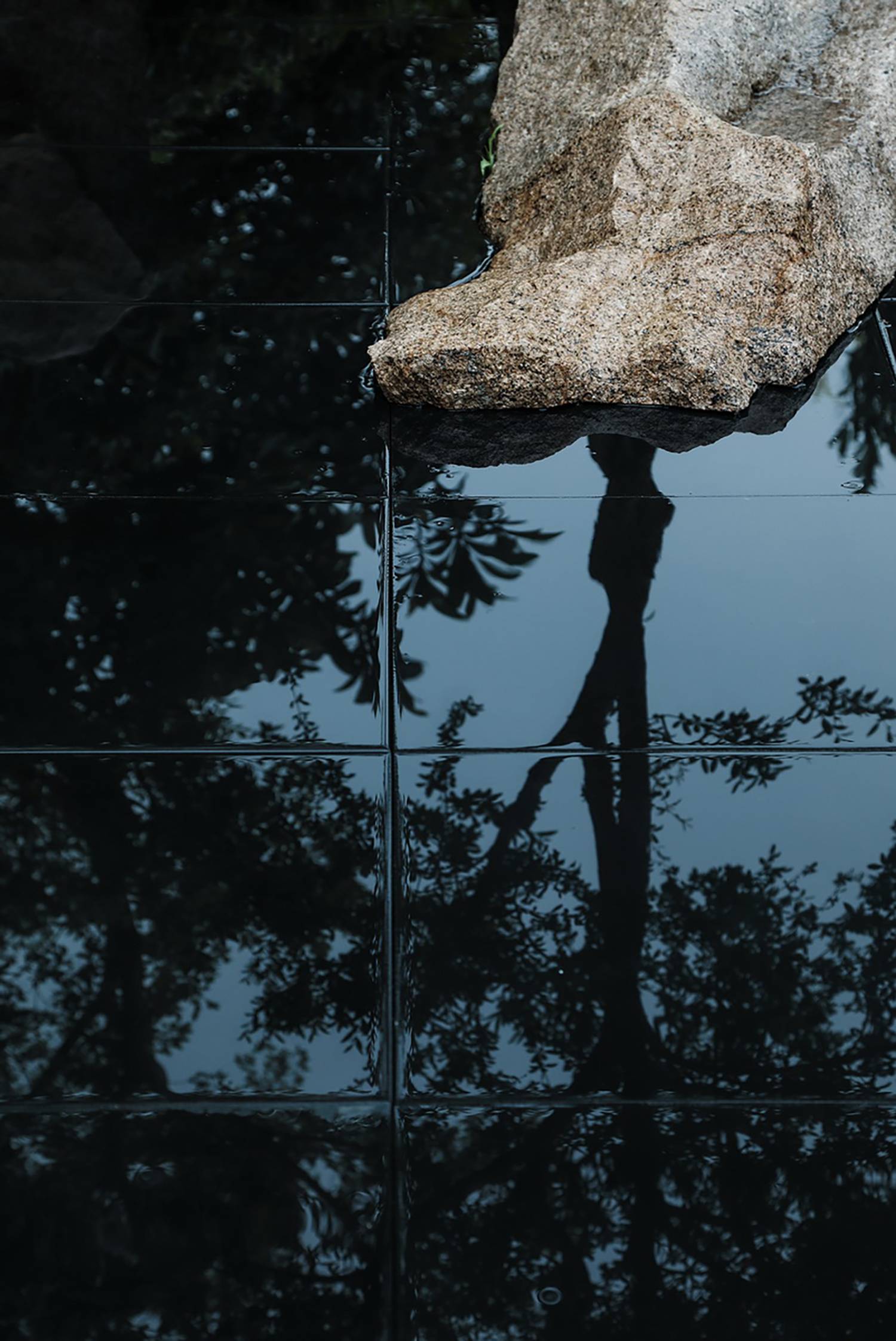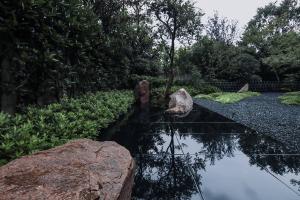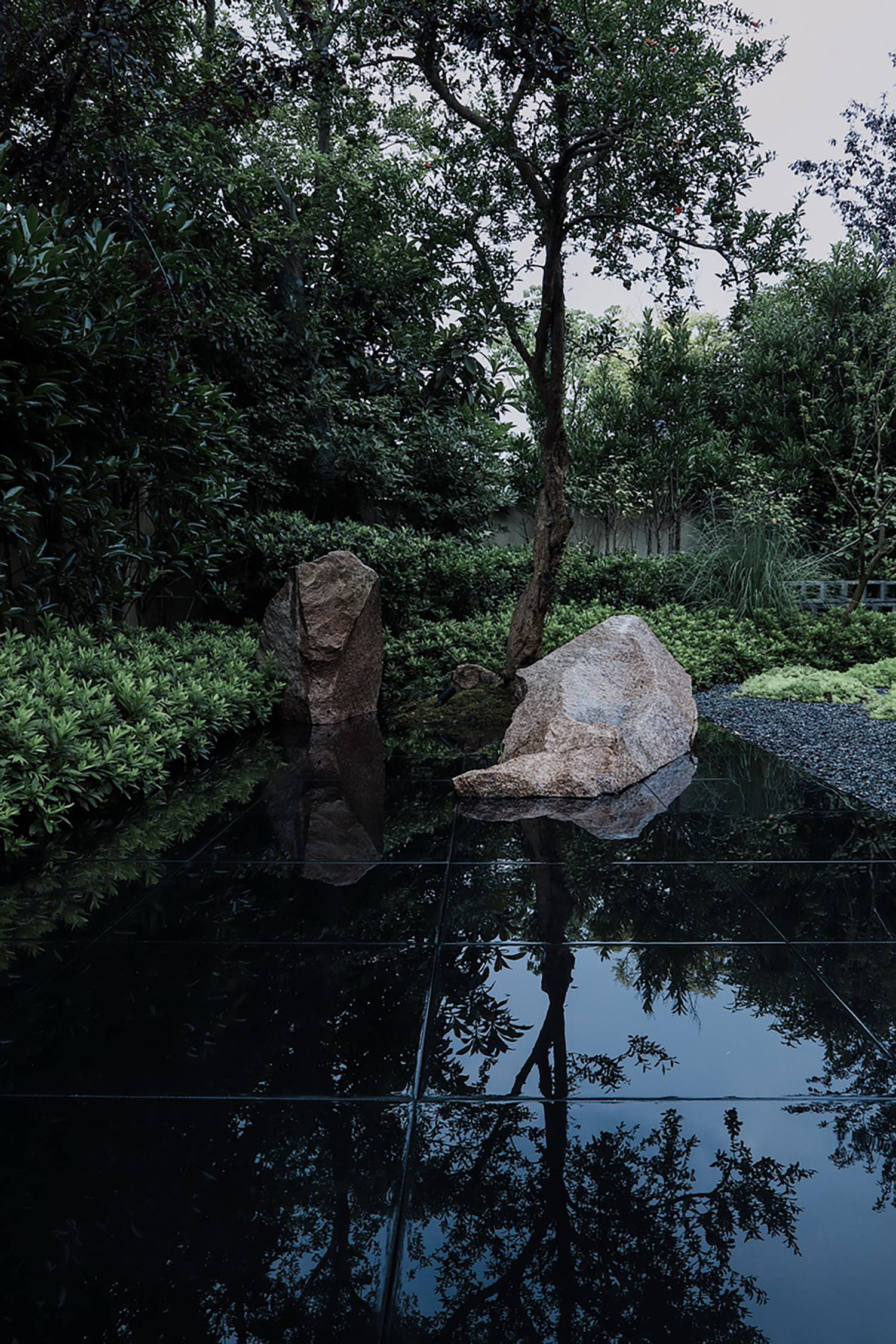 在庭院的西南角上做了一方池水,也是點(diǎn)題之舉。而此水并非真水,而是用黑色石材拋光后的鏡像效果代替了真水的效果。池中植一石榴,也增加了院子的生氣。此處的置石沿襲了中國造園里“一池三山”概念,我們將石料加以適當(dāng)?shù)娜斯?,讓他們?cè)谶@個(gè)抽象的園林里顯得更為融洽。