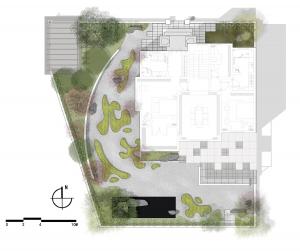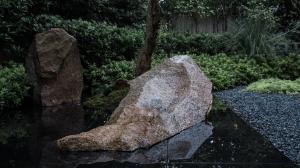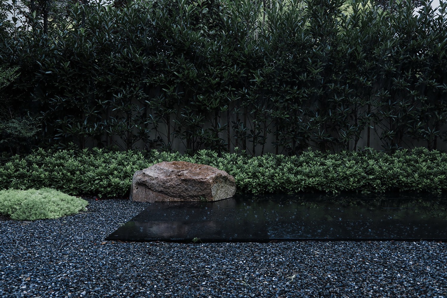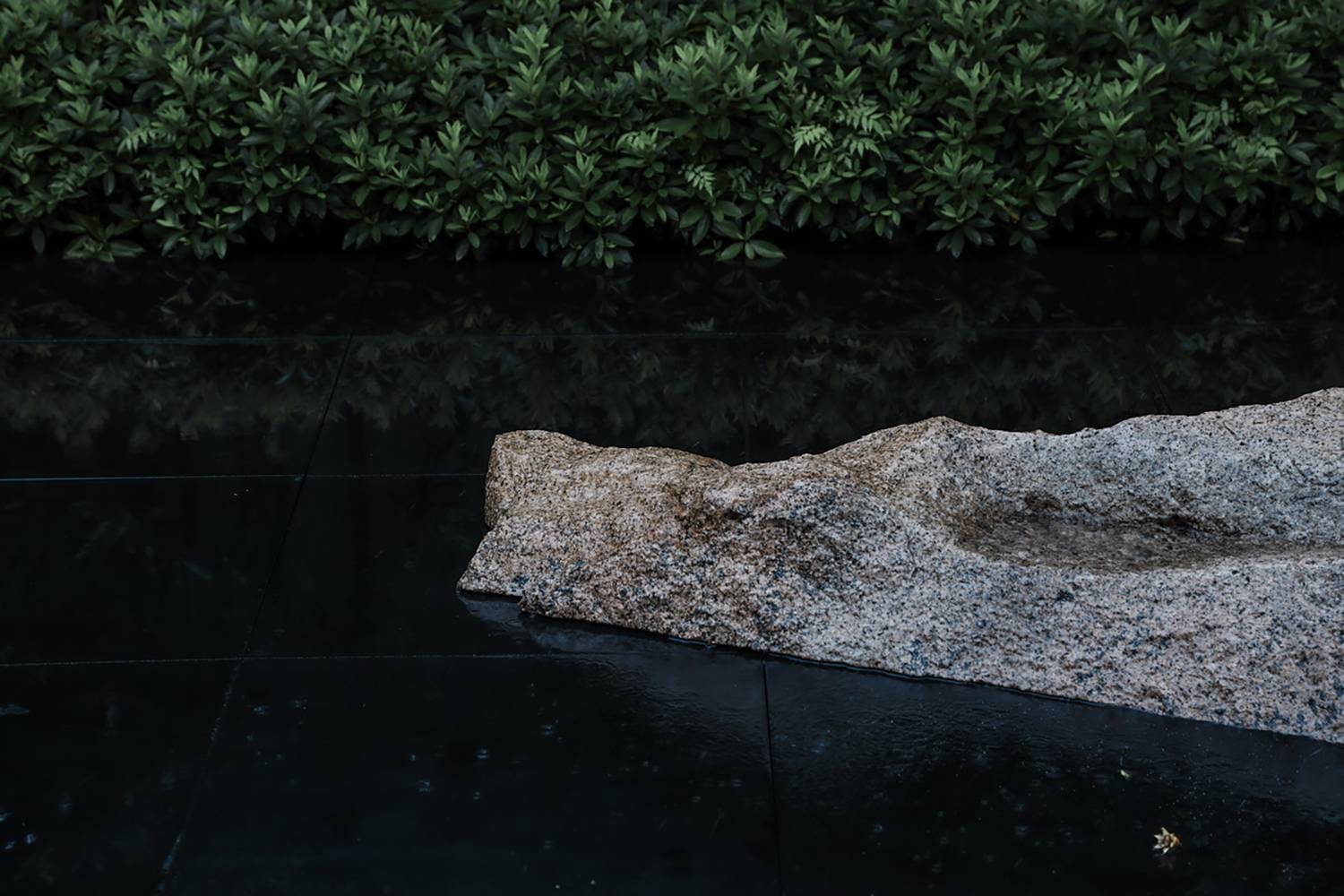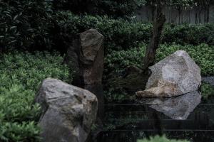在庭院的西南角上做了一方池水,也是點(diǎn)題之舉。而此水并非真水,而是用黑色石材拋光后的鏡像效果代替了真水的效果。池中植一石榴,也增加了院子的生氣。此處的置石沿襲了中國造園里“一池三山”概念,我們將石料加以適當(dāng)?shù)娜斯?,讓他們?cè)谶@個(gè)抽象的園林里顯得更為融洽。