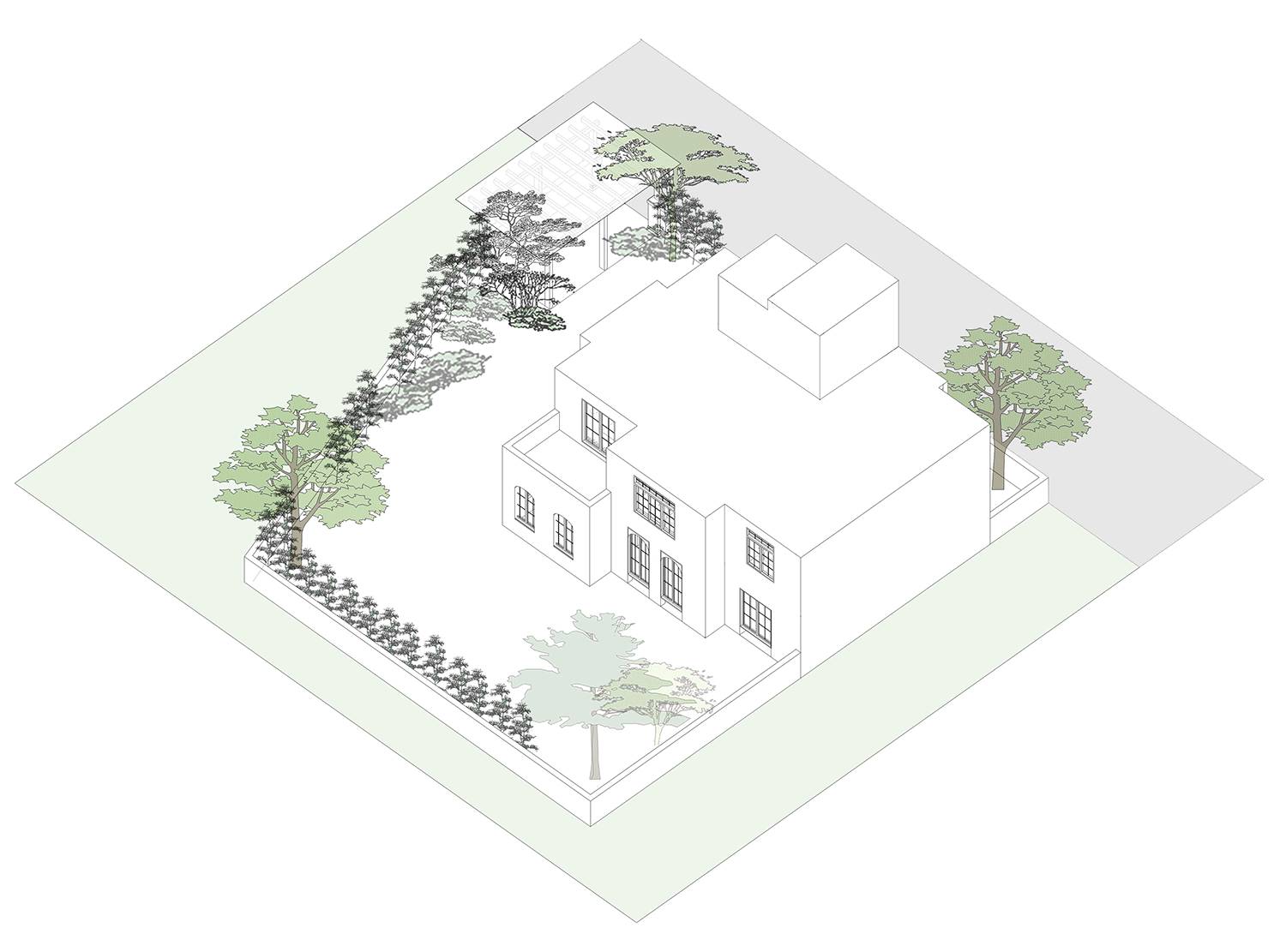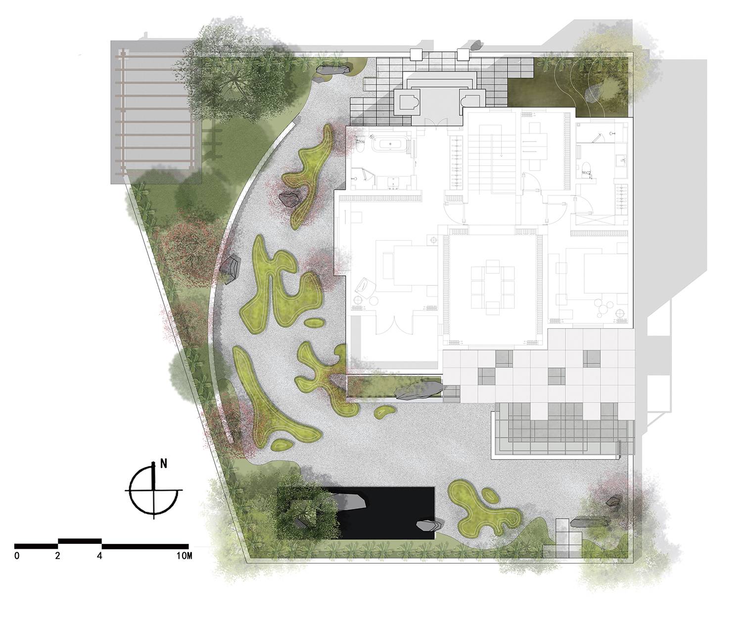 別墅是業(yè)主與朋友周末或假期的度假,或是文化沙龍、聚會(huì)的場(chǎng)所,而非日常生活空間。也不會(huì)長時(shí)間生活于此,因此在設(shè)計(jì)庭院到時(shí)候我們不需要考慮過多日常功能,但需要考慮低維護(hù)的因素。