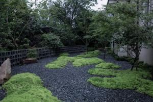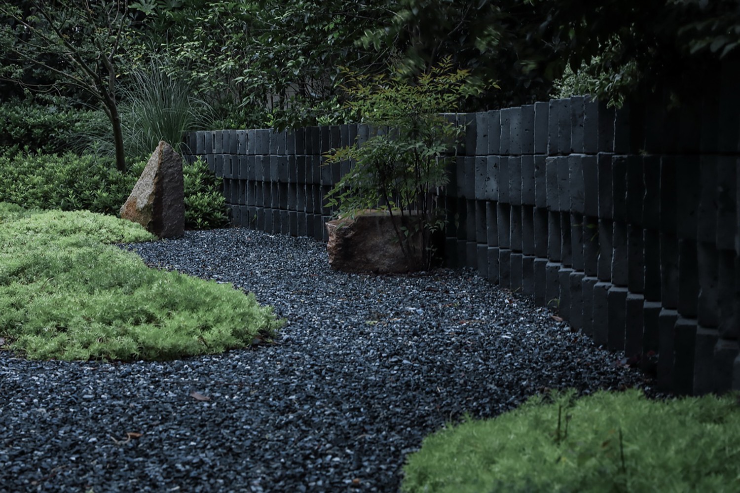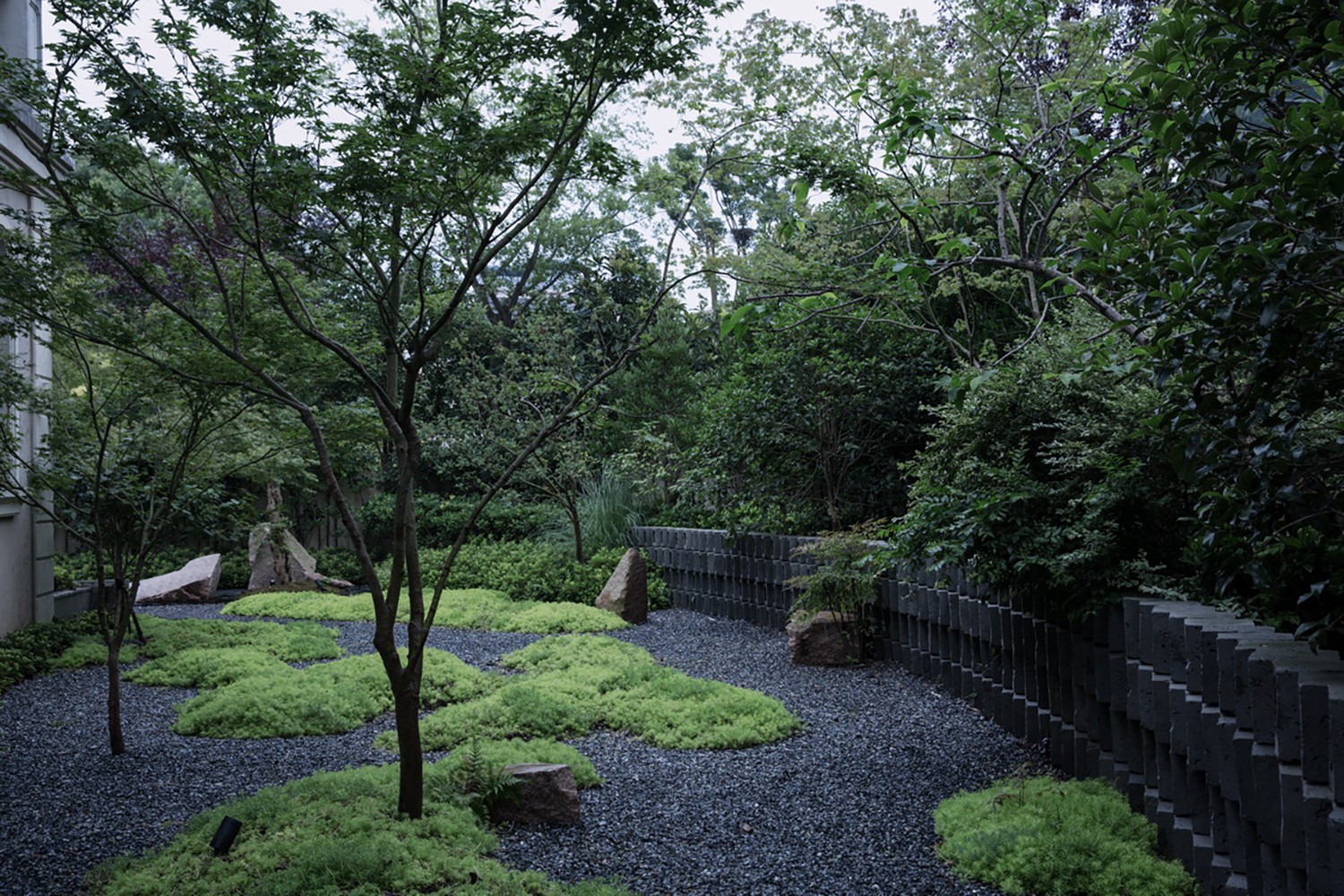 從客廳進(jìn)入庭院的地方我們?cè)黾恿艘粋€(gè)廊架,地面與室內(nèi)接平,通過這個(gè)灰空間讓室內(nèi)外形成過度,也給業(yè)主提供一個(gè)可遮雨的外擺空間。走出廊架,步入庭院,便是踩在礫石上。我們以礫石為底,綠植為圖,在場(chǎng)地上做了一幅可進(jìn)入的“抽象畫”。空間上面向客廳的東南處較為開放寬敞,越往西側(cè)轉(zhuǎn)而向北開始緊湊。西側(cè)部分以一道空心磚砌筑的弧形矮墻形成背景,將原有保留的綠化擋在外側(cè),其間補(bǔ)植些許雞爪槭,完善了林冠線。景墻內(nèi)側(cè)種植雞爪槭,形成一片楓樹林。下部空間只是簡(jiǎn)單的以佛甲草作為地被,鋪設(shè)成大大小小的抽象圖案——礫石為“水”,綠植為“島”。
