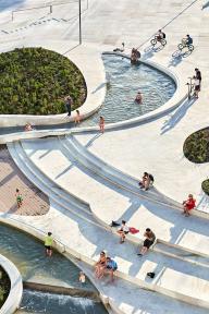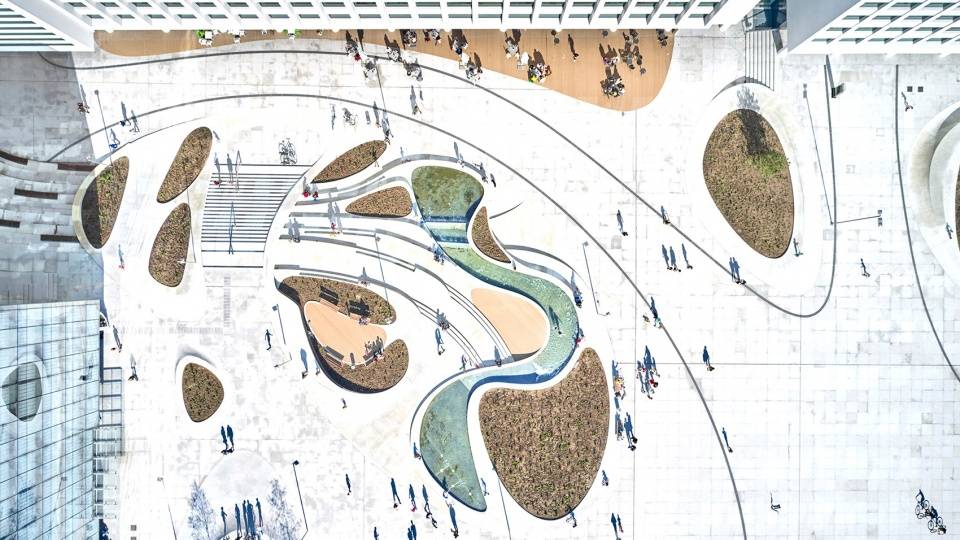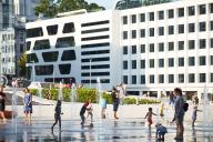 What was previously a largely unused space adjoined by historical buildings is now becoming a new, inviting public amenity where you can casually enjoy a coffee in your lunch break or get some work done outdoors while children play in the water, young people skate and students relax in the sun…