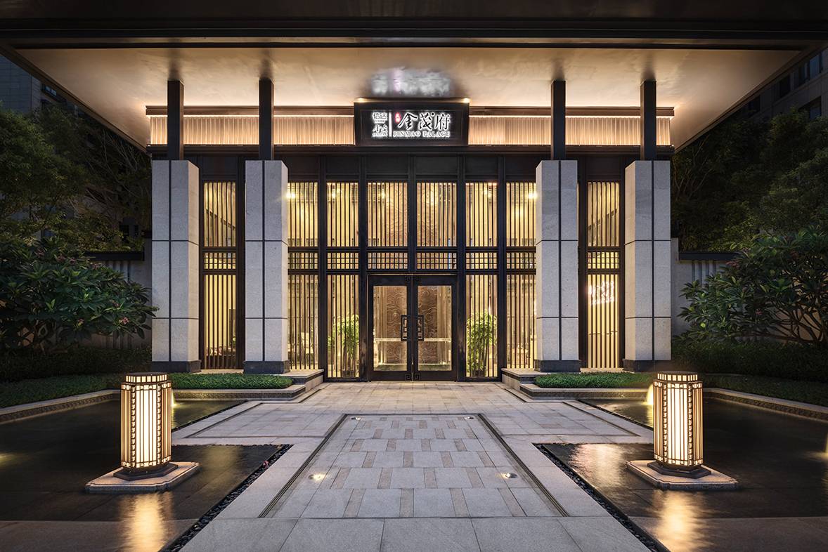 水,可寧靜致遠(yuǎn),其本身帶有著濃厚的禪宗意味。主入口布置鏡面水景賦予空間幽靜禪意的景觀氛圍,給人歸家之感,在儀式中增添靈動的韻律;門樓采取新中式風(fēng)格設(shè)計,彰顯府苑門風(fēng),與一進(jìn)院落的障景手法形成呼應(yīng),形成空間上的起承轉(zhuǎn)合。