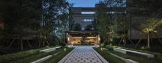 建筑、植物、小巧別致的燈具及通道兩側(cè)鏡面水景之間的虛實(shí)相生,光影變化,增添空間趣味和意境。