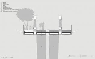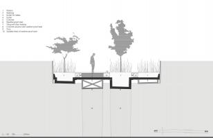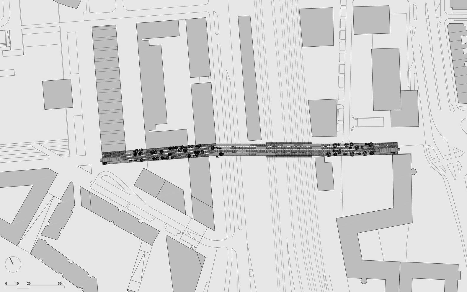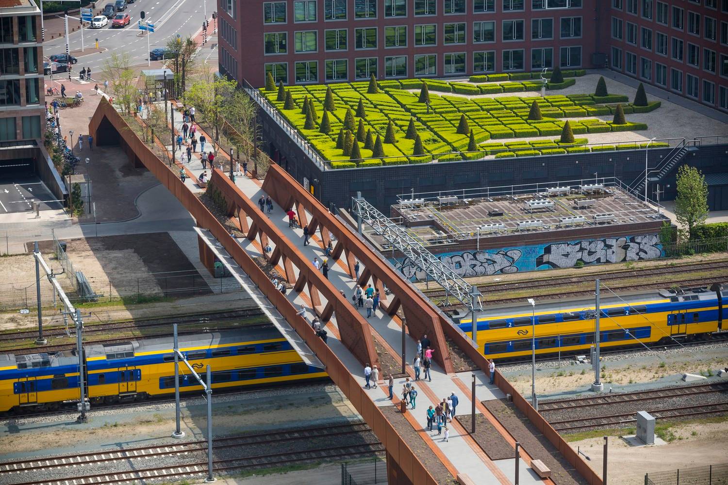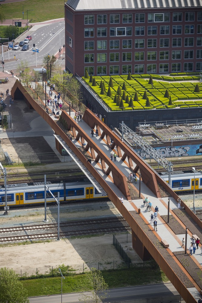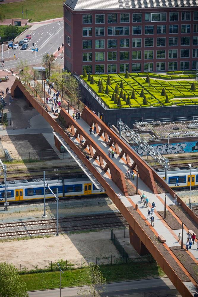 在與Piet Oudolf合作中,確定了橋上的花壇和樹的位置和種植方案。橋上的植物和灌木被分成三個(gè)區(qū)域,每個(gè)區(qū)域都有自己的特點(diǎn)。在城市中心的一側(cè),橋處于較低的位置,還有大草原般的植物和樹木。橋穿過(guò)鐵軌的地方,這里有低矮的植物,寬闊的景色。在Paleiskwartier橋的兩側(cè),將會(huì)看到更多具有森林般特色的景觀。