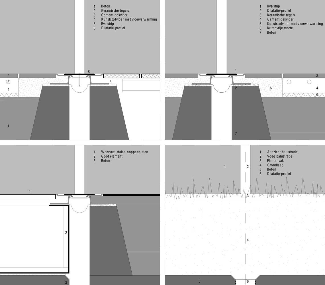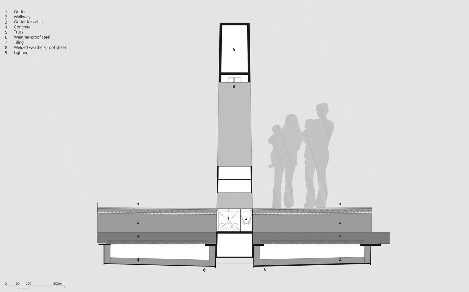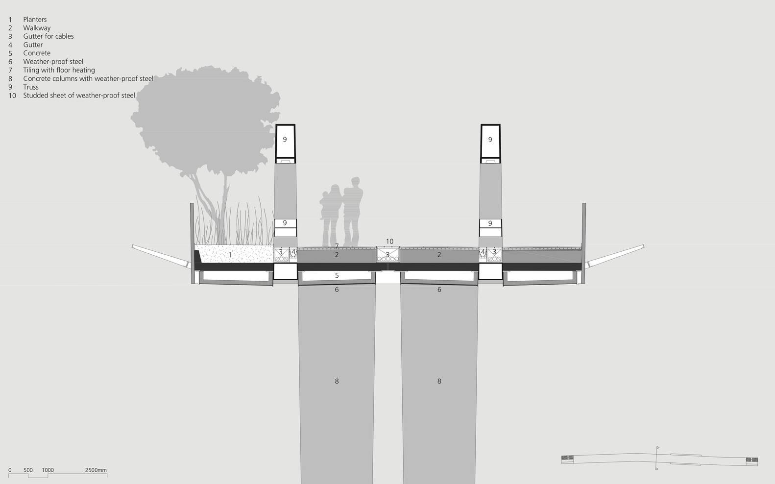 Paleisbrug是由大小各異的橋墩支撐,被覆蓋在耐用鋼上,整齊的一排形成一個(gè)整體的跨度??缍劝M向的耐用鋼管道覆蓋混凝土壓縮層??缍仍酱?,管道越高。全長(zhǎng)60米的大跨度,甚至可以穿過(guò)鐵軌。這使得額外的桁架接頭得以在橋面上創(chuàng)建。列車通過(guò)需要大量的空間,整個(gè)橋就被占據(jù)了?;炷翂嚎s層有樹的地方被設(shè)計(jì)成窗孔結(jié)構(gòu)。在鋼箱梁中創(chuàng)造了一張樹床。穿孔的位置,無(wú)論是對(duì)種植方案還是結(jié)構(gòu)來(lái)說(shuō),總是有好處的。另外,橋上的混凝土是被隱藏的。整座橋分四車道,每道2米寬,花壇和路面交織,跨越橋的長(zhǎng)度。路面上的色帶有六十厘米寬,耐侯鋼釘板構(gòu)成,鋪設(shè)在花壇和道路之間。其中的電纜,可以在街道上的雨水排水管和排水溝看到。如果需要的話,這座橋橋面和管道設(shè)施是可以更換的。