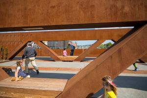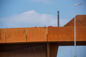 建筑師采用紅銹色的耐候鋼板作為主材料。植物,樹木,鋪路,家具和照明已開始采用折疊的耐用鋼作為材料。這種鋼就是為該項(xiàng)目而生的。耐用鋼是一種具有密集腐蝕層的鋼合金,腐蝕過(guò)程處于靜止?fàn)顟B(tài)。耐用鋼,每100年才腐蝕約0.5毫米,比其他材料薄1毫米,鋼的兩側(cè)是最先開始腐蝕的。因此,這座橋至少有100年的壽命。此外,該鋼的堅(jiān)固的外形很符合城市的防御工事的進(jìn)行。
