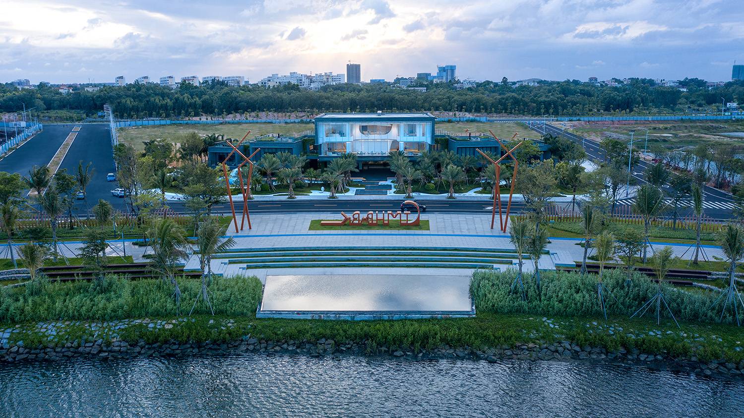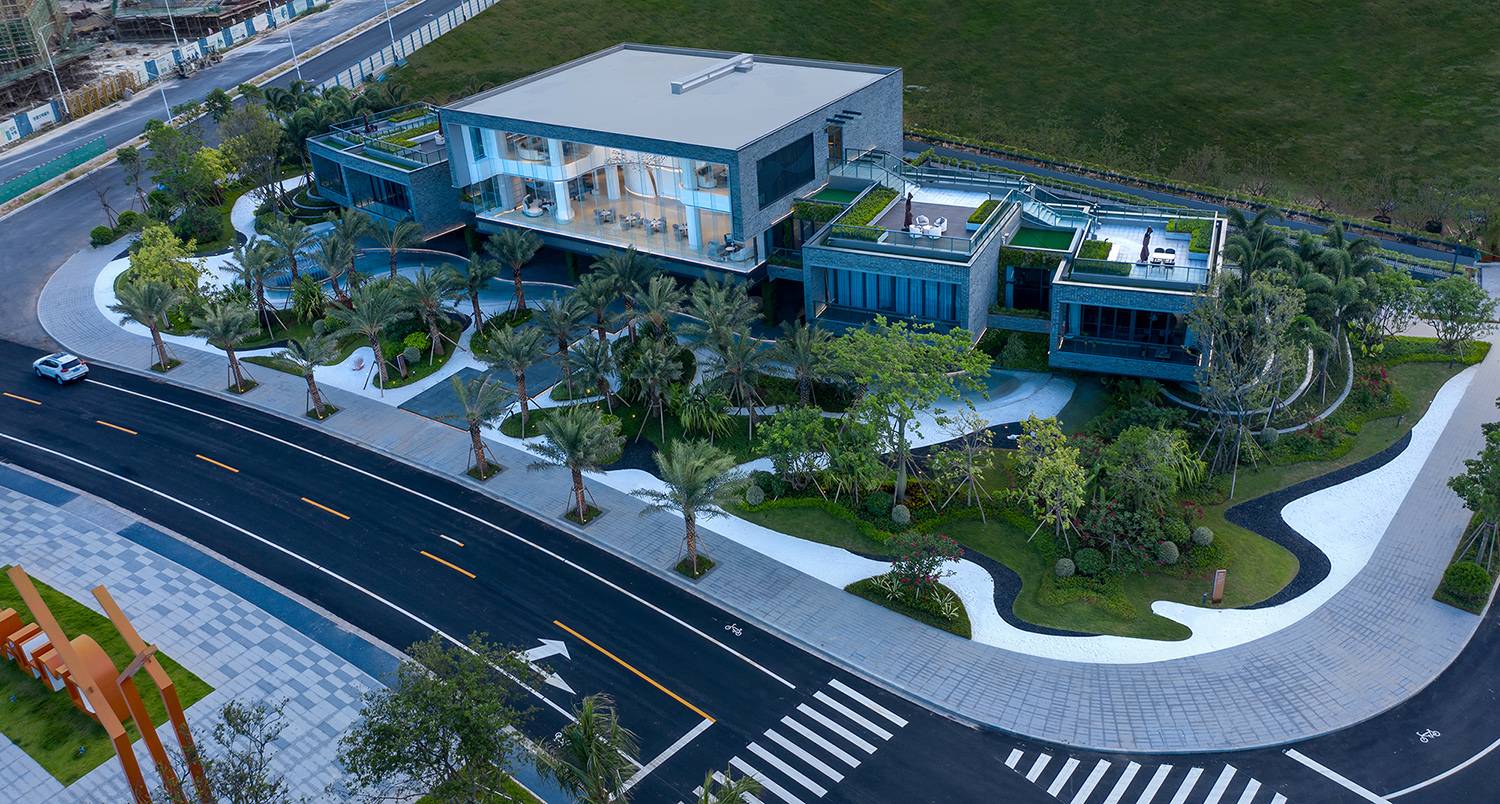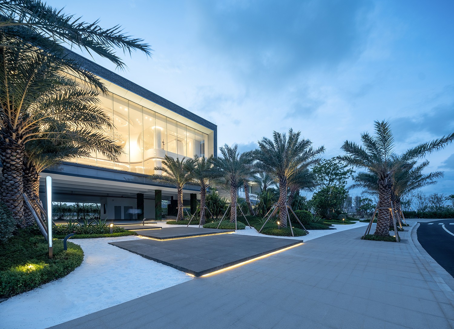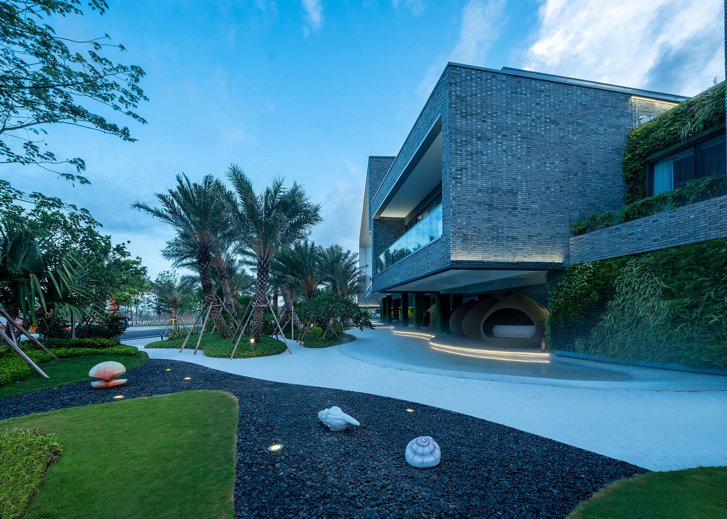 展示區(qū)的建筑造型現(xiàn)代簡約,以玻璃盒子的形態(tài)向海岸敞開,打造270°超廣角視野,碧海藍天盡收眼底,外立面巧妙利用砌磚藝術(shù)的無限可能,提煉嶺南建筑最具代表性的灰墻青磚元素表現(xiàn)在簡約時尚的建筑體量中,現(xiàn)代與傳統(tǒng),時尚與經(jīng)典的結(jié)合,塑造抽象含蓄而品位高雅的設(shè)計內(nèi)涵。