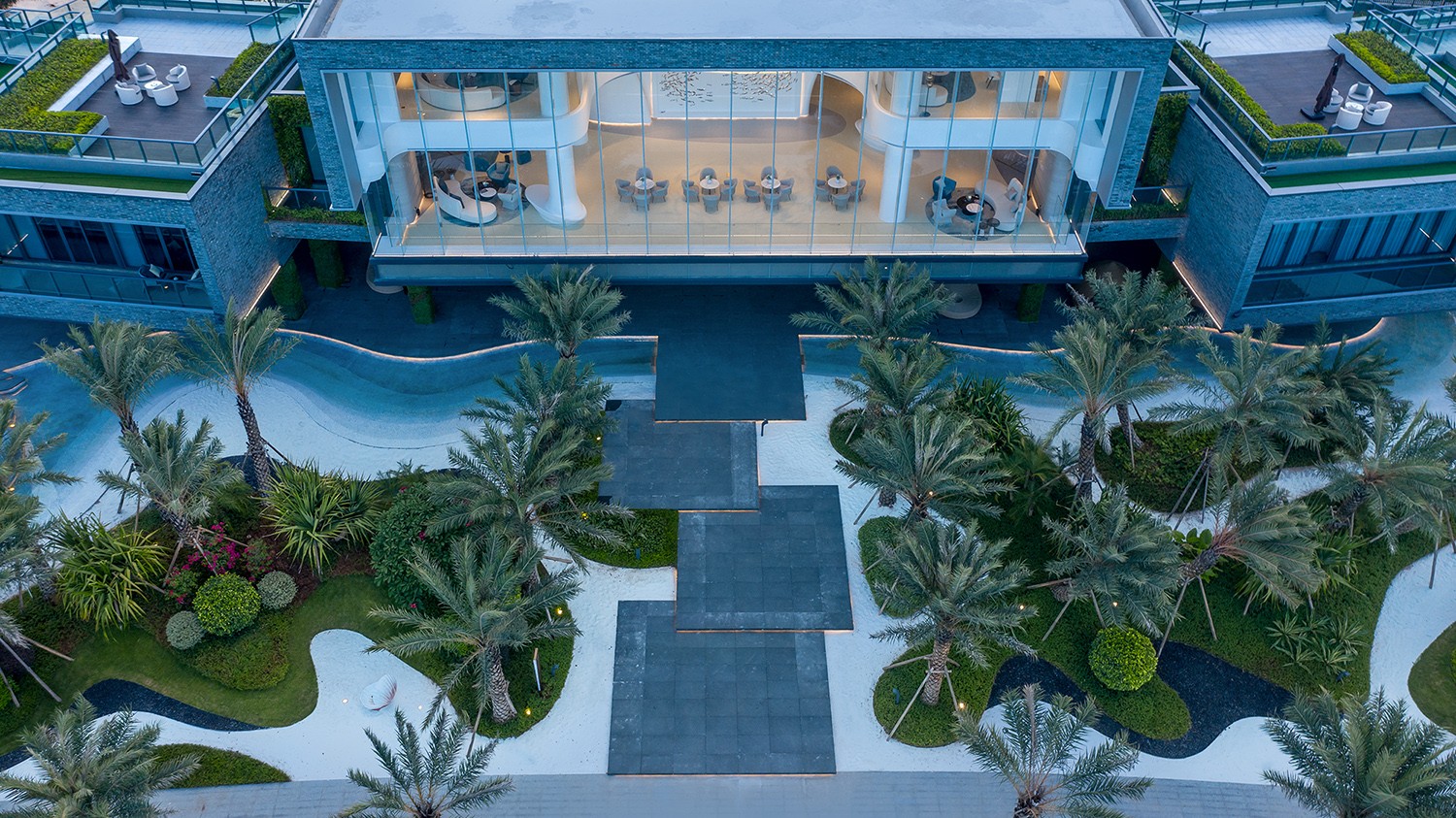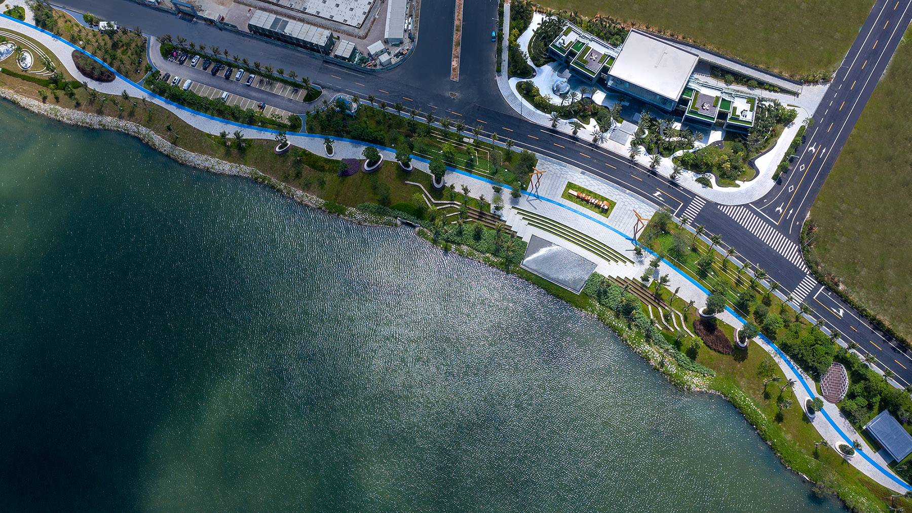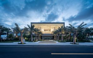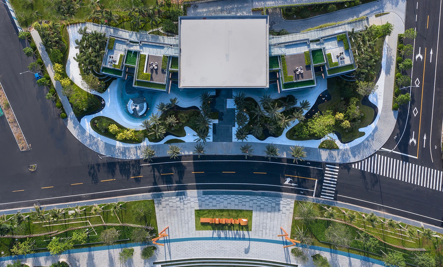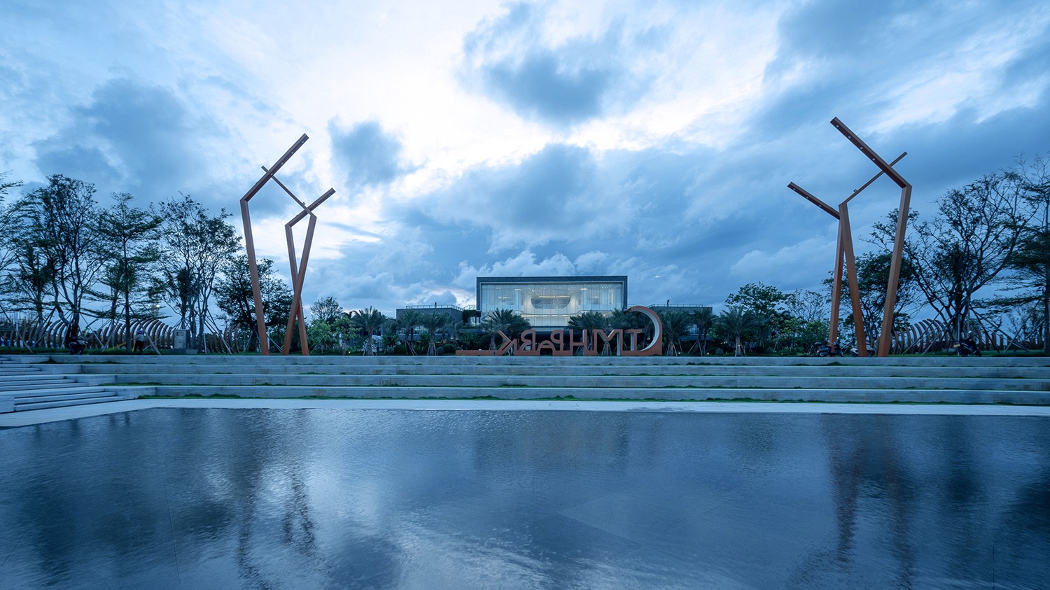 展示區(qū)的建筑造型現(xiàn)代簡約,以玻璃盒子的形態(tài)向海岸敞開,打造270°超廣角視野,碧海藍天盡收眼底,外立面巧妙利用砌磚藝術(shù)的無限可能,提煉嶺南建筑最具代表性的灰墻青磚元素表現(xiàn)在簡約時尚的建筑體量中,現(xiàn)代與傳統(tǒng),時尚與經(jīng)典的結(jié)合,塑造抽象含蓄而品位高雅的設(shè)計內(nèi)涵。