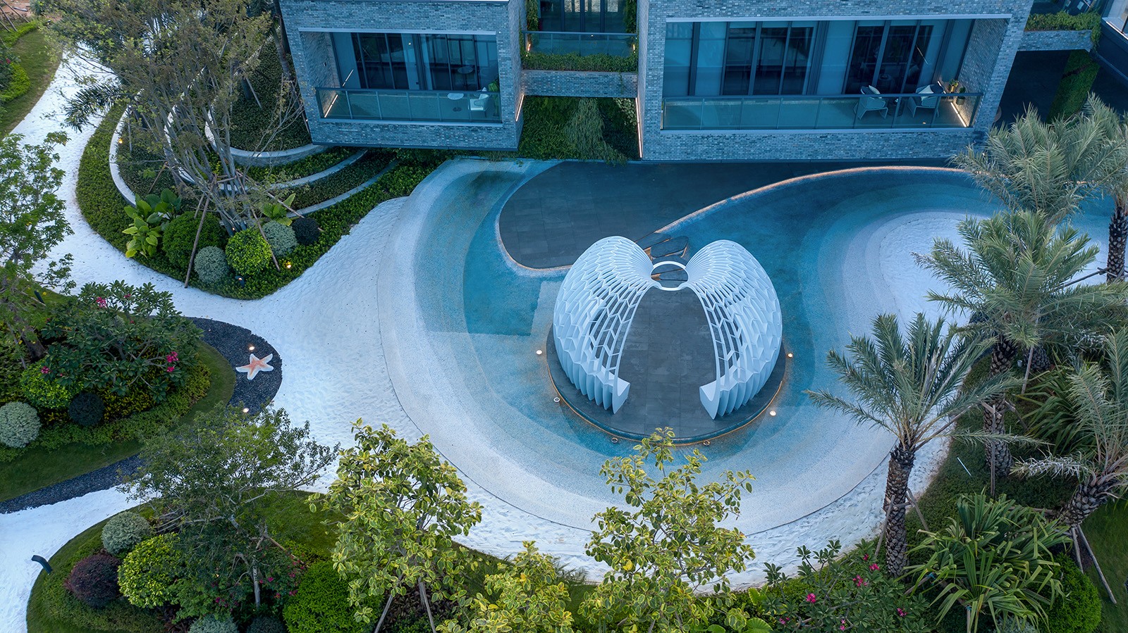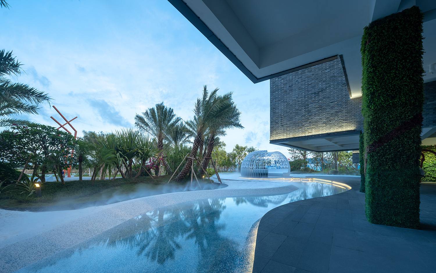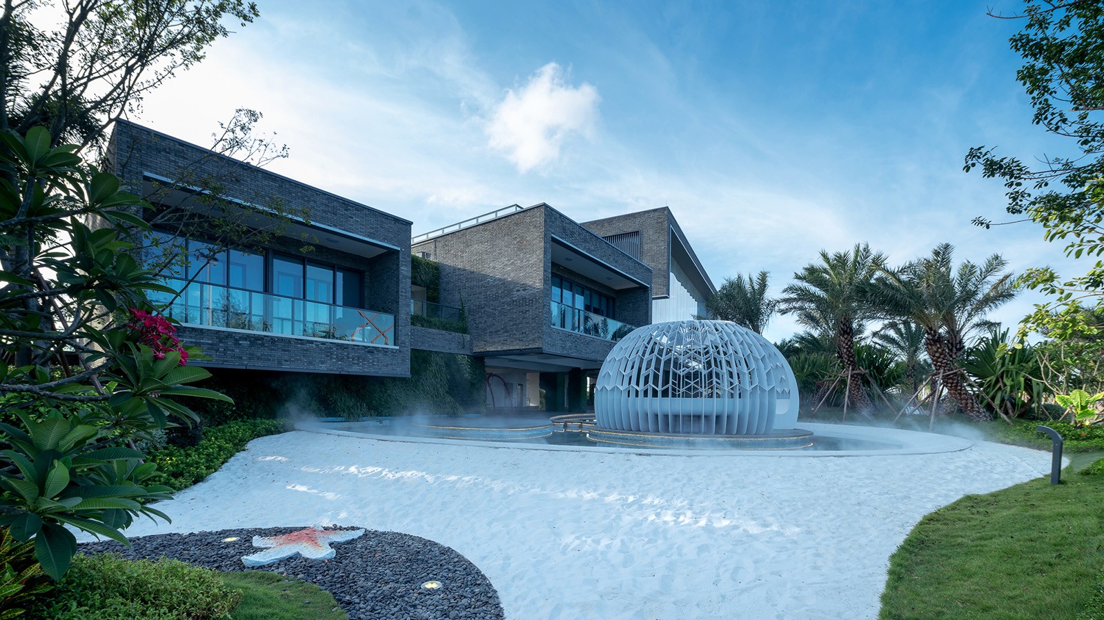 整個海洋元素在景觀上的運用,形體上追求海岸的曲折、海島起伏與堆疊,體現(xiàn)海洋的多變與自由。經(jīng)由趣味大臺階汀步,進入蜿蜒的海岸景觀,是漫沙水庭,隨著水霧的迷蒙飄渺,更顯浪漫海居韻味。