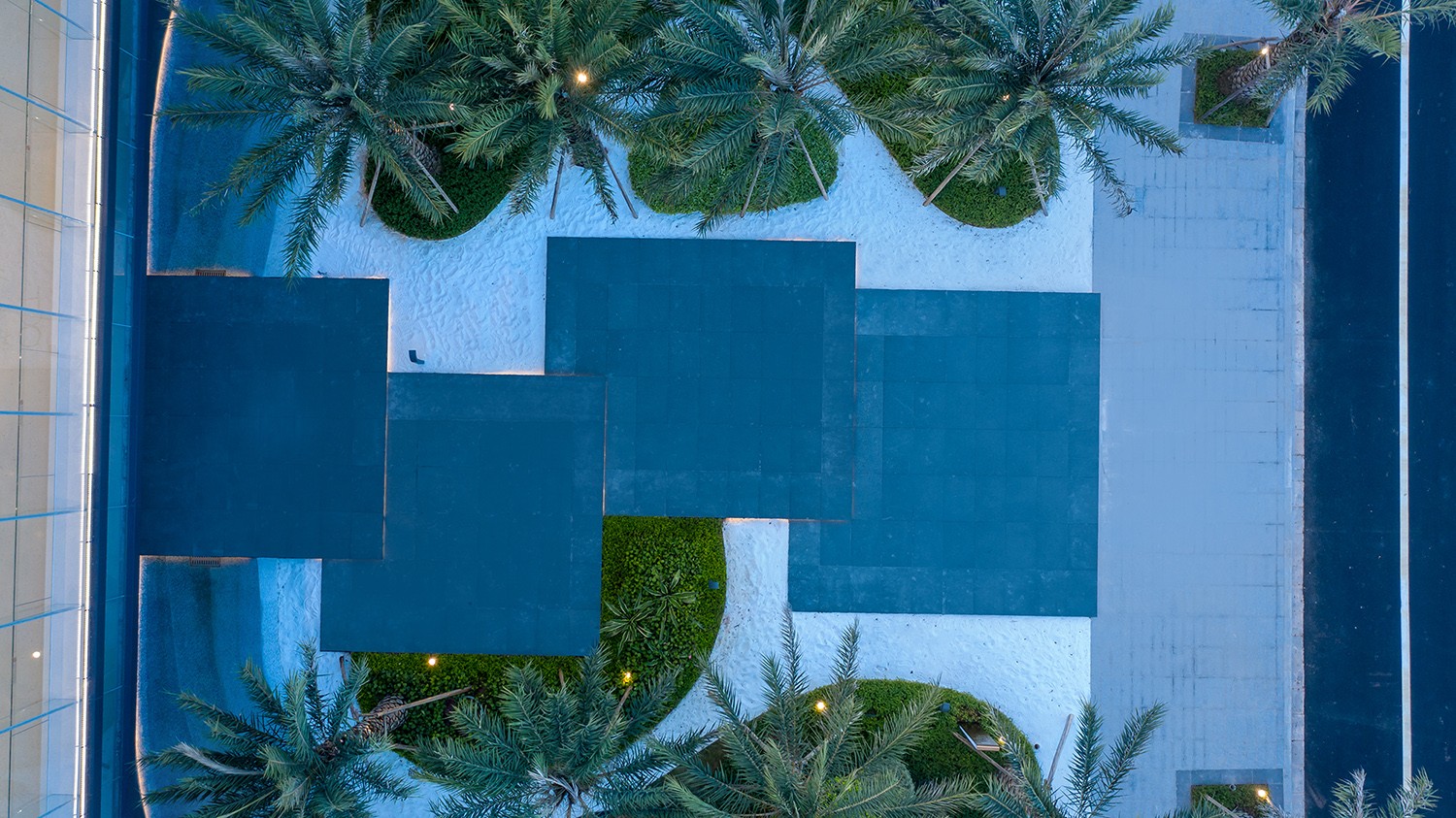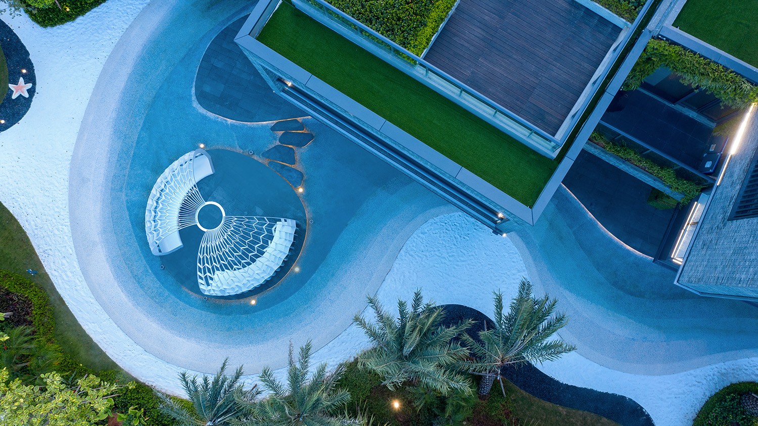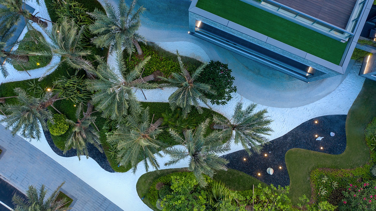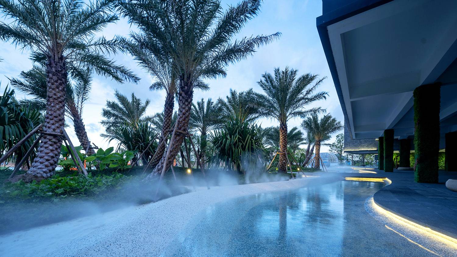 整個海洋元素在景觀上的運用,形體上追求海岸的曲折、海島起伏與堆疊,體現(xiàn)海洋的多變與自由。經(jīng)由趣味大臺階汀步,進入蜿蜒的海岸景觀,是漫沙水庭,隨著水霧的迷蒙飄渺,更顯浪漫海居韻味。