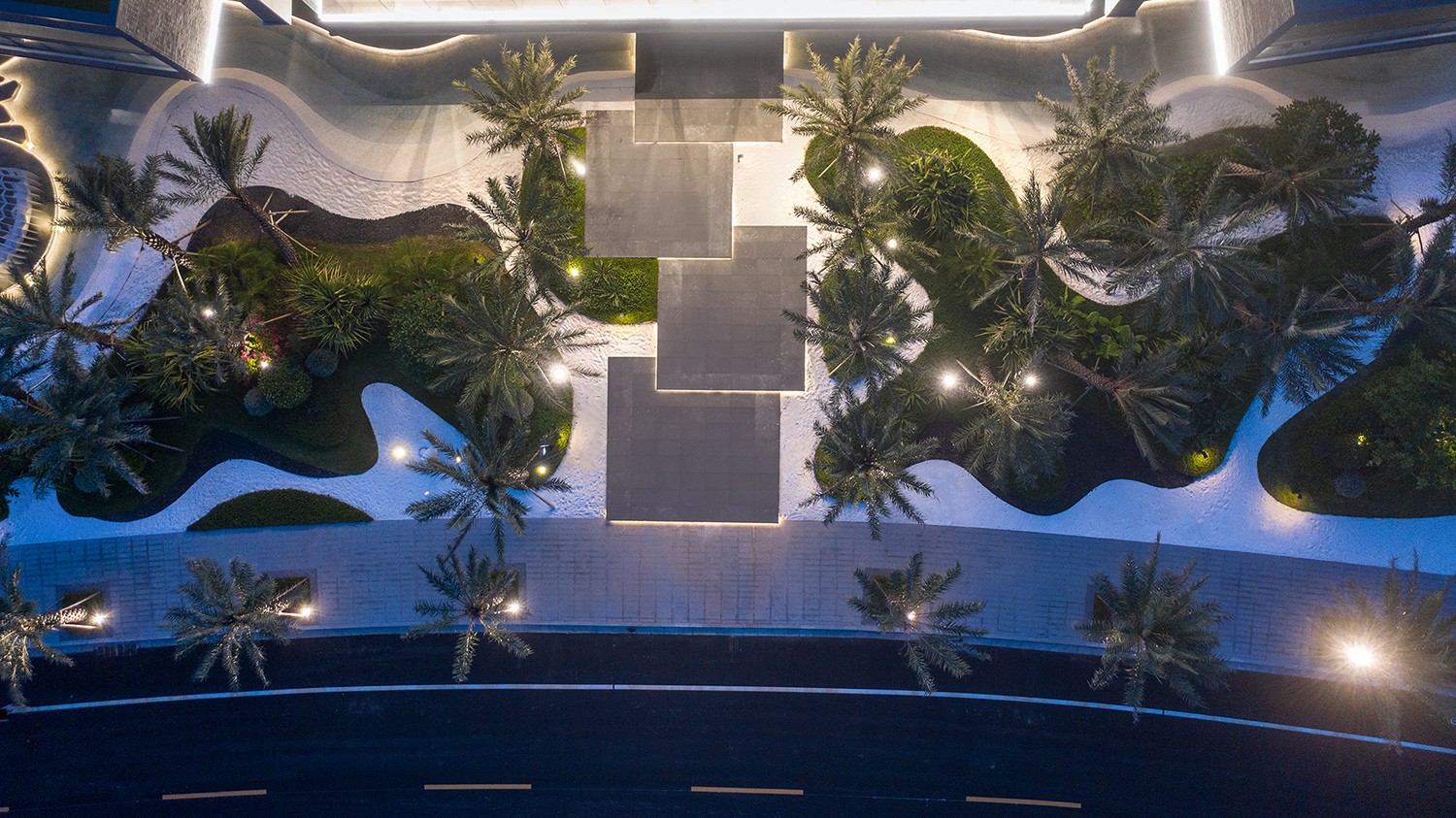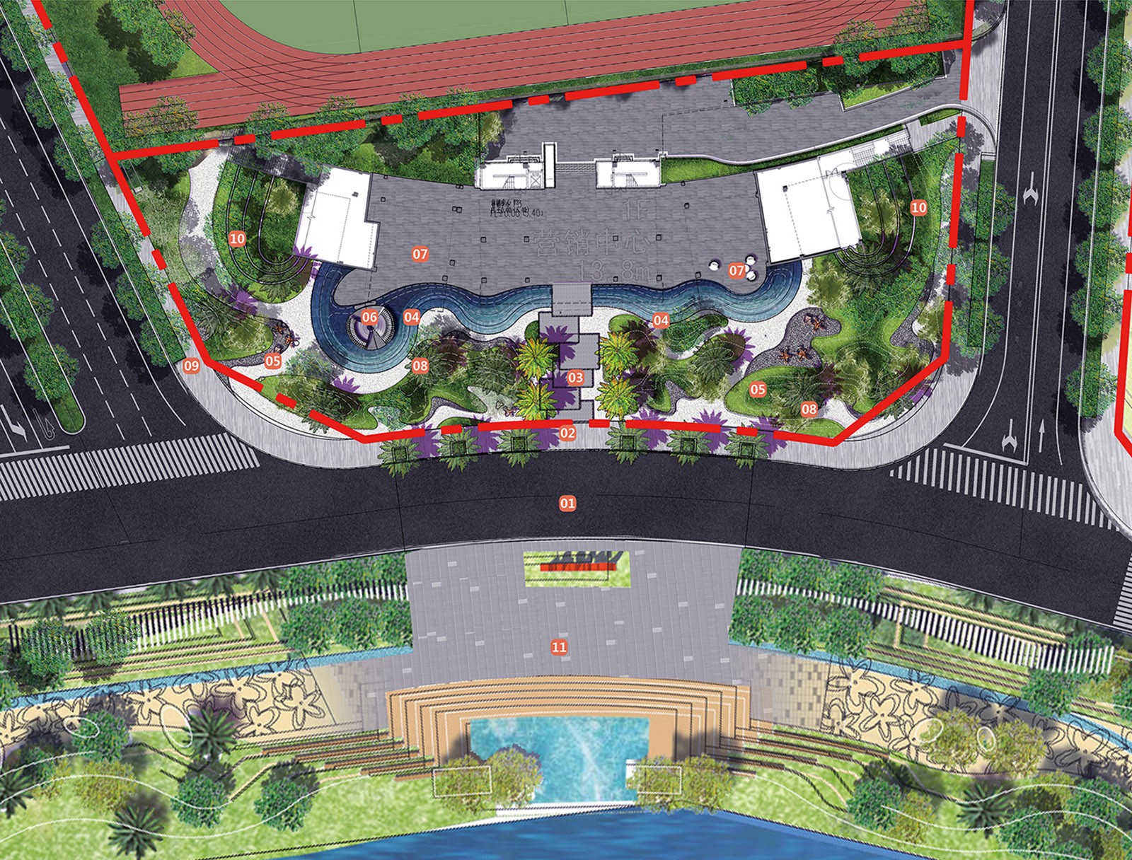 主入口的設(shè)計注重質(zhì)感與空間體驗,以藝術(shù)手法呈現(xiàn)疊級景觀,通過特色汀步疊階,漫步休閑海域,椰風(fēng)愜意,海沙漫延,植物設(shè)計上采用喬木陣列與特色地被的種植層次,營造大氣疏朗的景觀風(fēng)格。