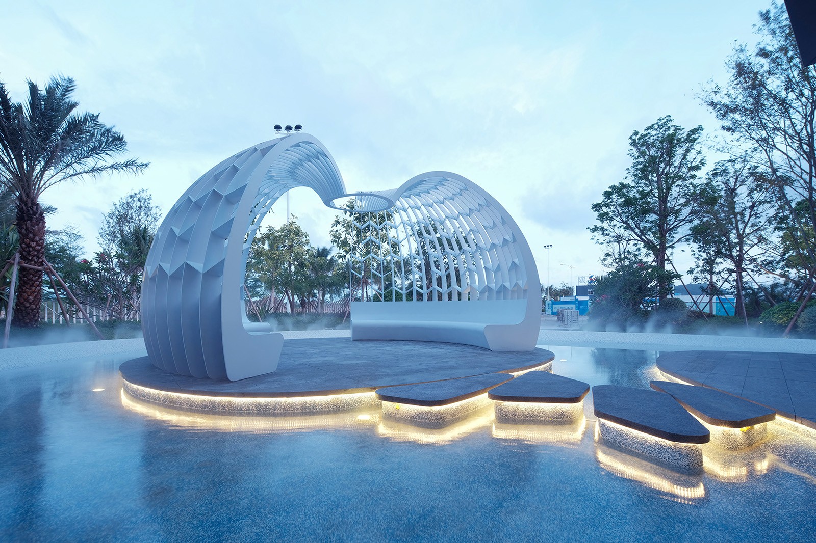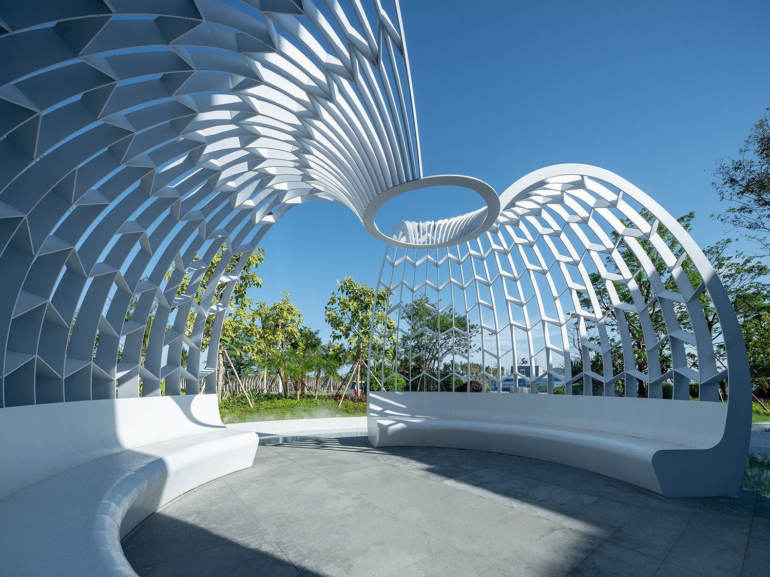 涉沙而行,一路有彩色貝殼、海螺、海星點綴,似引導(dǎo)人走向海洋深處。踏過水中汀步,有一方藝術(shù)性的雕塑停泊水面,通透現(xiàn)代的海螺廊架成為景觀焦點,于光影斑駁中靜享海上風(fēng)情。