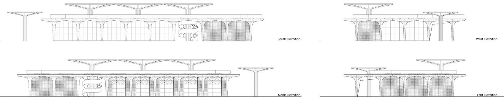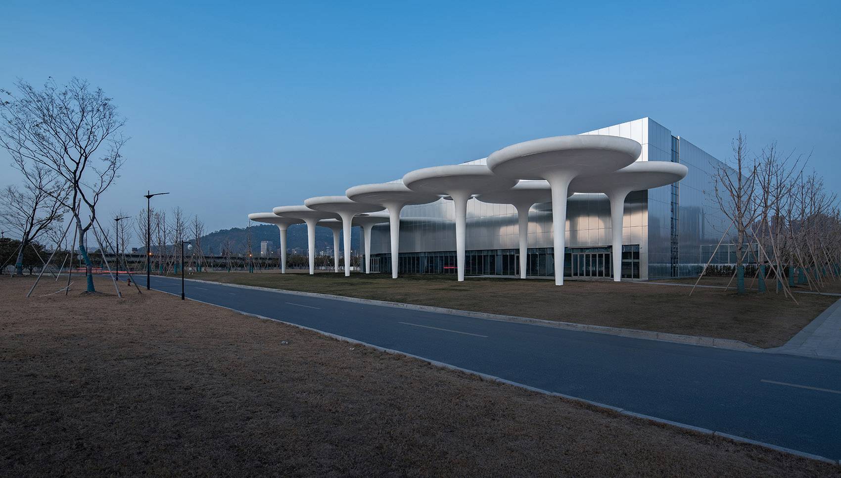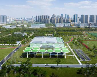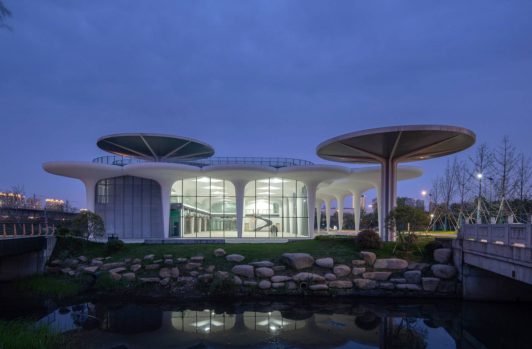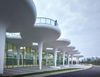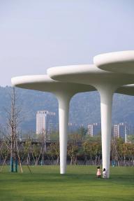 以生態(tài)、開放、景觀化為設(shè)計(jì)理念,我們選擇傘狀結(jié)構(gòu)作為建筑的基本單元。單個(gè)傘狀單元體量感弱且偏景觀化,形態(tài)鮮明;圓形頂棚庇護(hù)下的底部空間,開放自由,與環(huán)境高度融合。多個(gè)傘狀單元相連接,亦可構(gòu)成特點(diǎn)鮮明的內(nèi)部空間。
