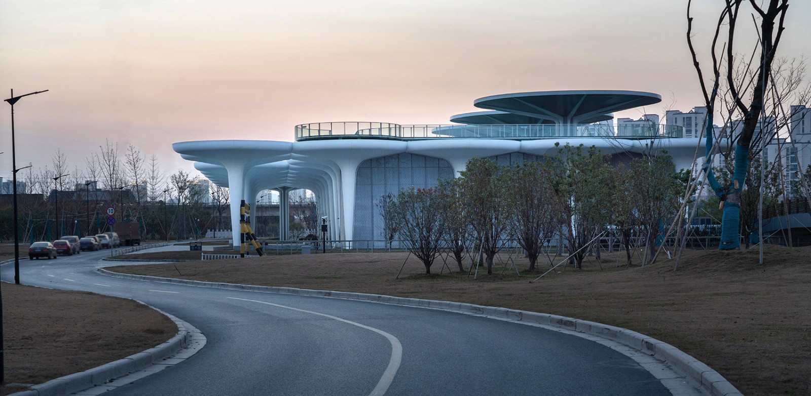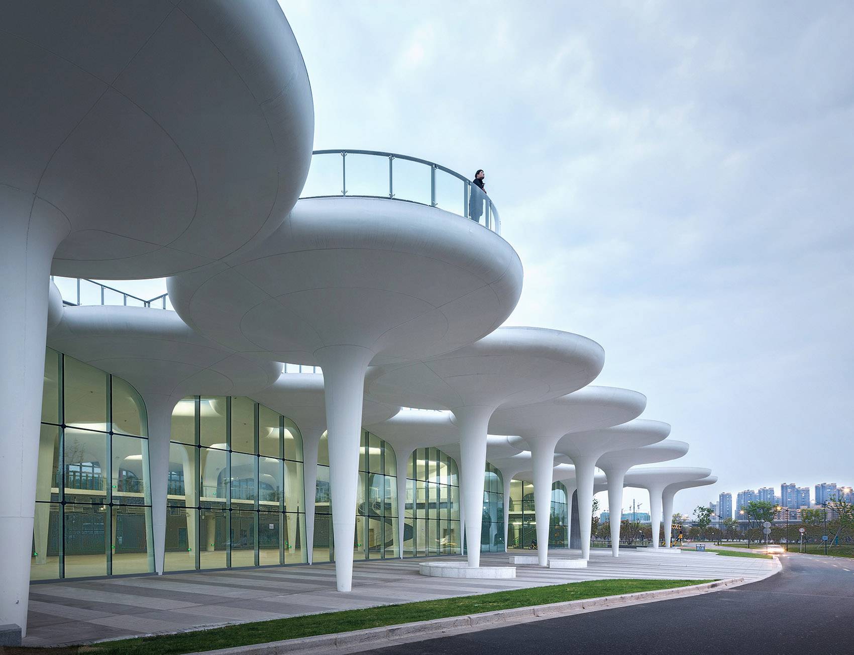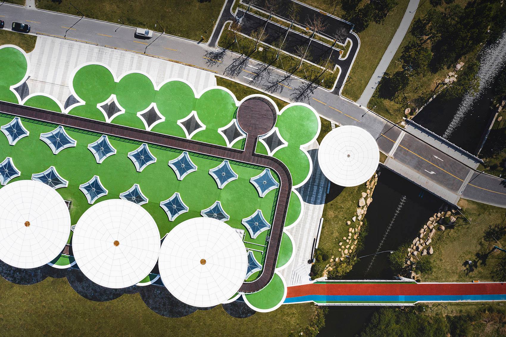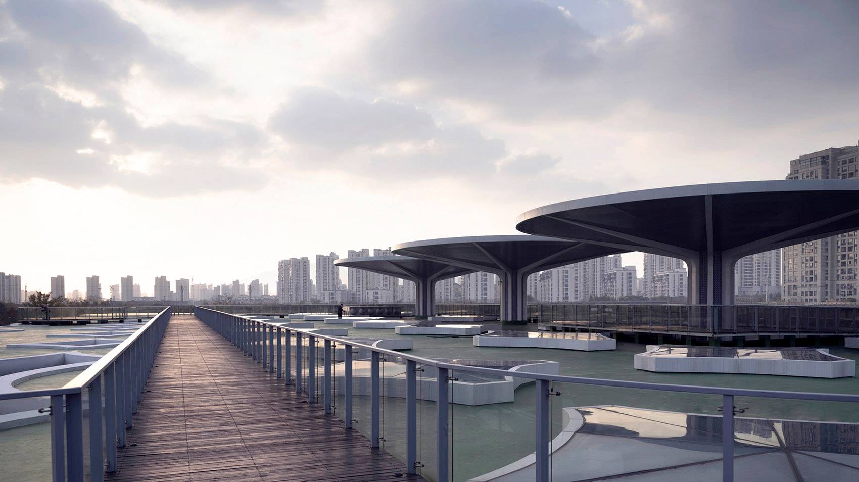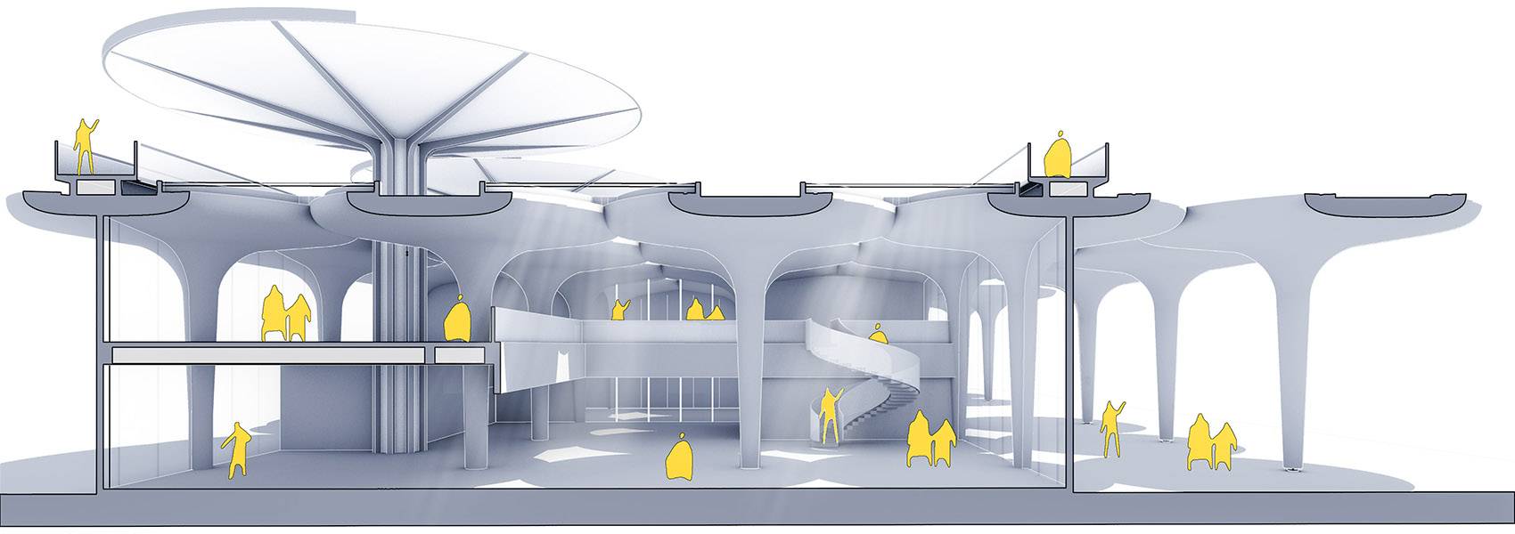 為了提升建筑的標(biāo)識(shí)度,我們?cè)诮ㄖ兄踩肓巳齻€(gè)直徑為20m的大型傘單元,并以其中一把傘為支點(diǎn)設(shè)計(jì)了連接地面與屋頂?shù)穆菪龢翘?,市民的活?dòng)經(jīng)由螺旋樓梯從地面延伸到了屋頂環(huán)形跑道,市民在這里觀景或是運(yùn)動(dòng),獲得了一種漂浮于公園之上的全新體驗(yàn)。