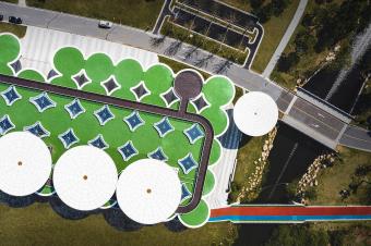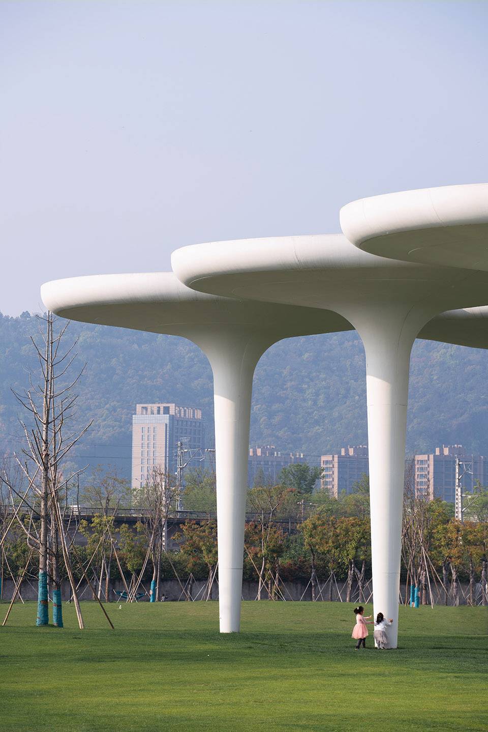 ▲孩子在傘狀灰空間下玩耍