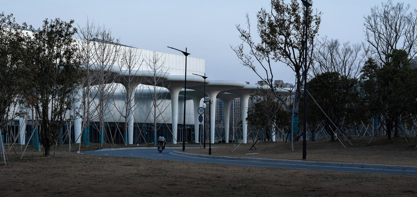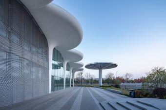 健身中心場(chǎng)館面積約3800㎡,由49個(gè)包裹白色GRC及灰白色鋁板的傘狀單元構(gòu)建而成,場(chǎng)館輕盈通透,開放自由,如同一片凝固的樹林,公園的綠化、廣場(chǎng)、跑道暈染到其中,與場(chǎng)館復(fù)合共享。在這里,建筑與自然相互滲透,市民可以從四面八方自由地穿行到其中。
