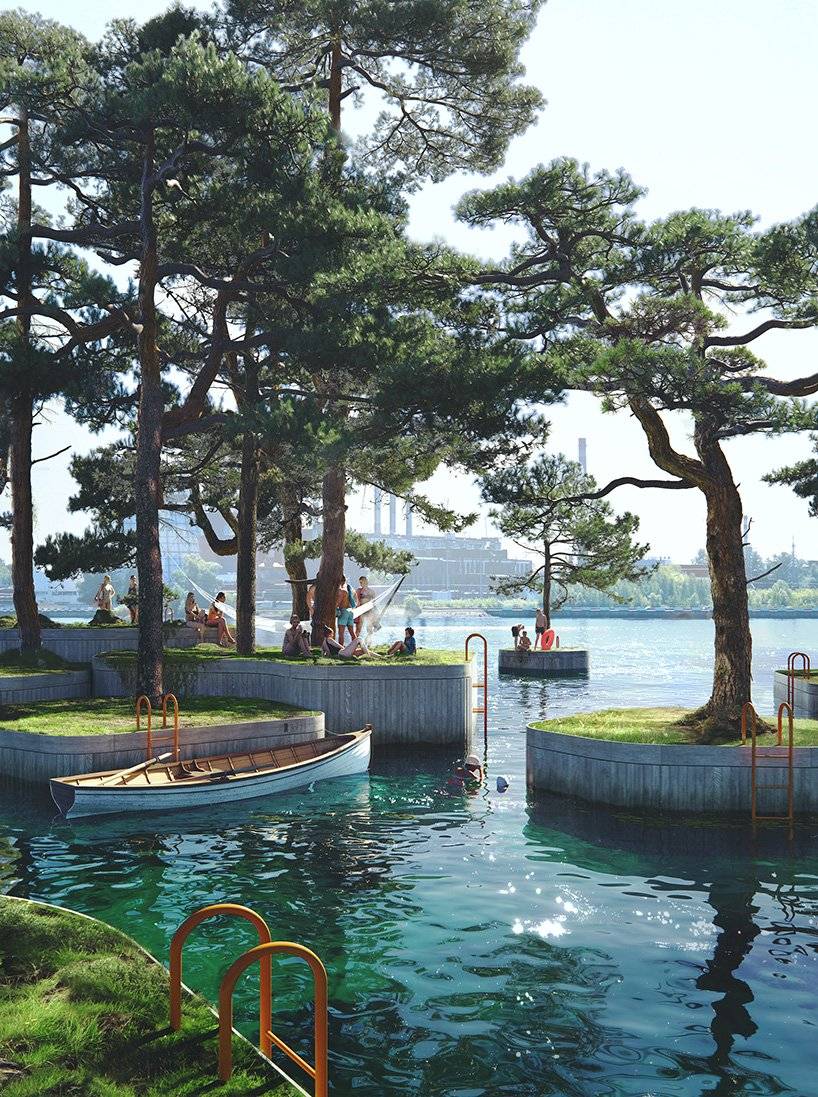 Marshall Blecher & Studio Fokstrot設(shè)計(jì)的哥本哈根群島是一個(gè)自成一體的生態(tài)系統(tǒng),水面上方生長著本都特有的植被,樹木和草地,為睡覺休息和昆蟲棲居提供了棲息地。在水面下,固定的錨點(diǎn)為海藻、魚類和軟體動(dòng)物提供了新的家園。漂浮群島在這座城市的一角提供了不斷變化的、大片的綠地,代表了一種新型氣候適應(yīng)性的城市規(guī)劃。漂浮的結(jié)構(gòu)具有功能上的內(nèi)在靈活性,它們使用了可持續(xù)和可重復(fù)利用的材料。