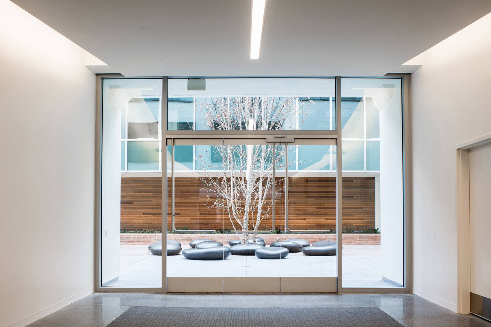 該庭院是Airbnb總部與珠寶中心間的重要視覺(jué)通廊。樹木和富有雕塑感的石塊置于主走廊中央,作為最有沖擊力的元素,引導(dǎo)人們前往Airbnb的總部大廳。庭院的幾何形狀與建筑有機(jī)結(jié)合,并與建筑內(nèi)部空間相呼應(yīng),使室內(nèi)外空間產(chǎn)生強(qiáng)有力的聯(lián)系。