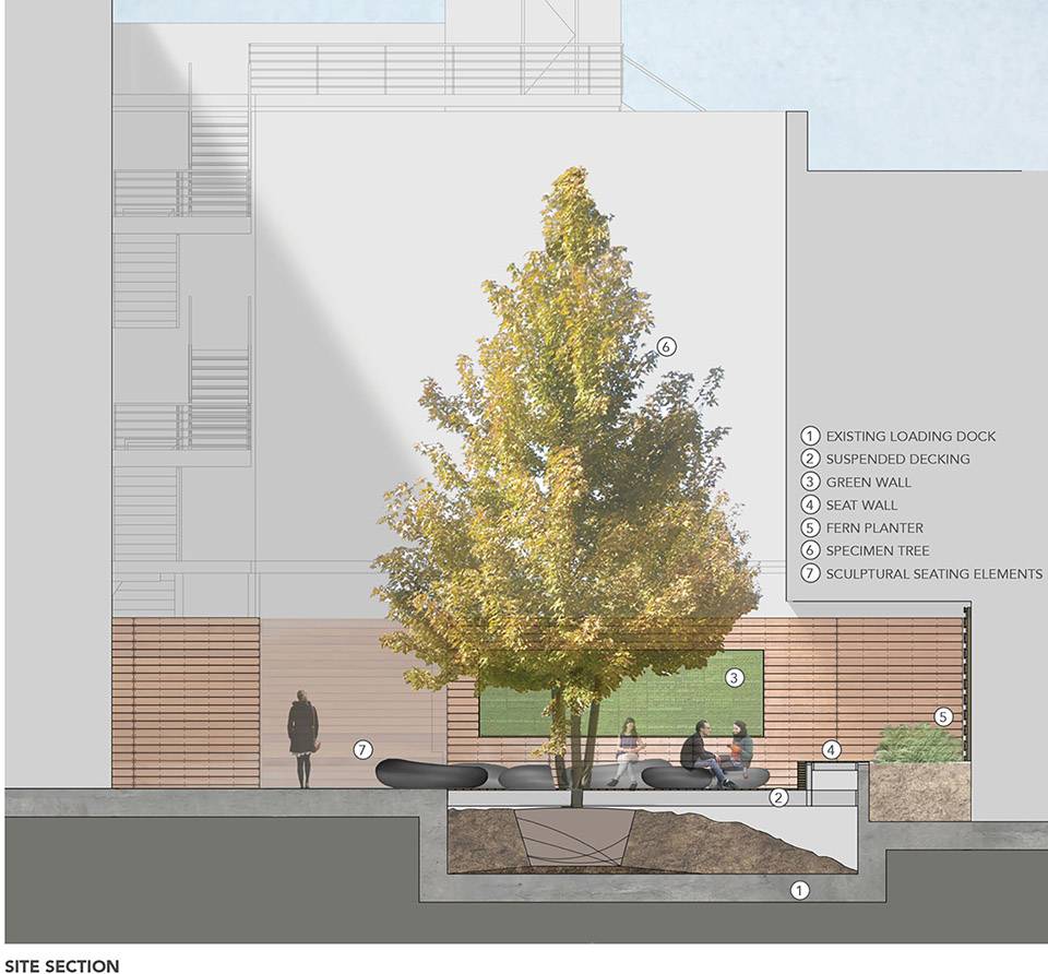 ▲庭院剖面,廣場(chǎng)甲板與原地面之間填充土壤