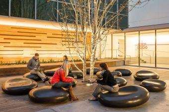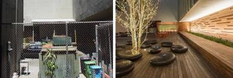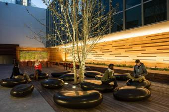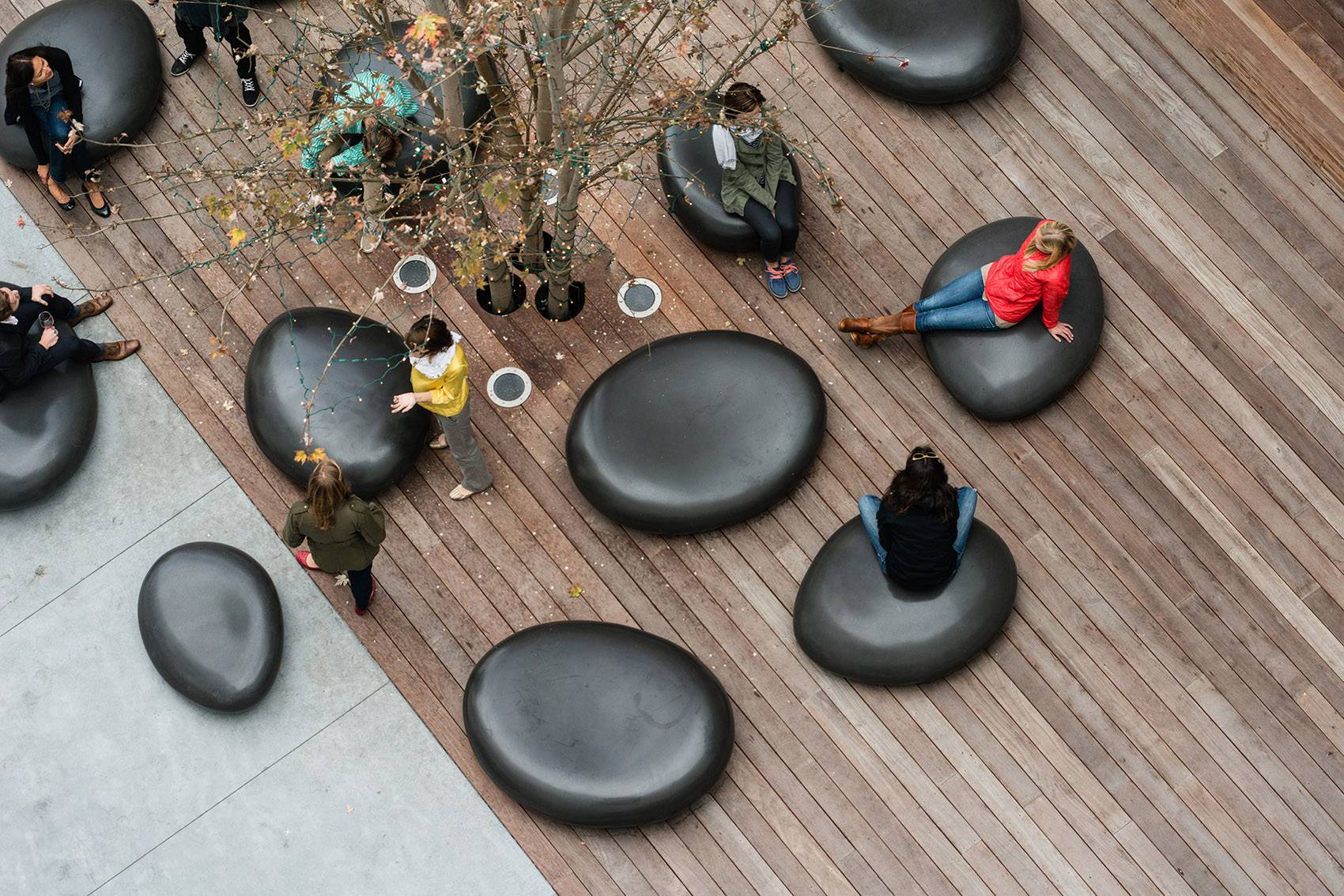 木制廣場(chǎng)設(shè)置在原裝卸平臺(tái)之上,圍繞一棵造型優(yōu)美的進(jìn)口楓樹展開(kāi)。楓樹周圍散落著寶石般的石塊讓這個(gè)庭院與眾不同,使庭院成為周圍工作人員社交,工作和進(jìn)餐的好去處。
