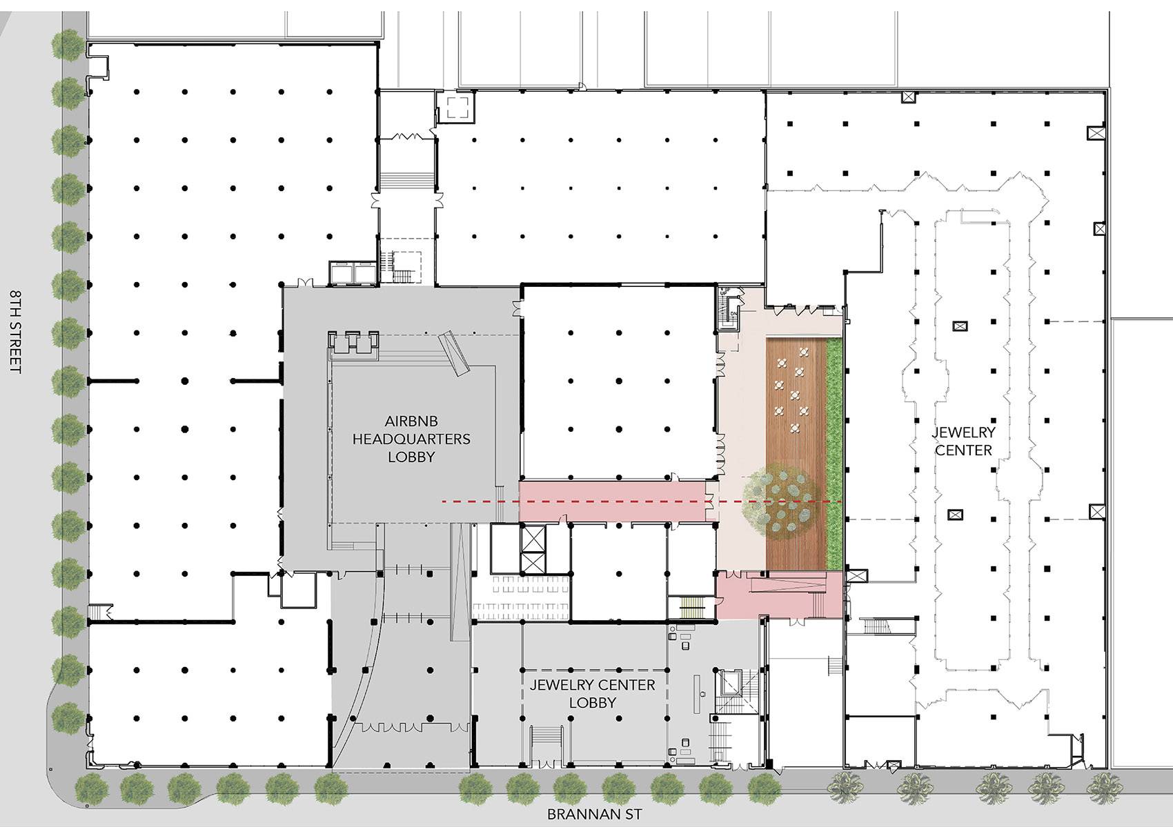 M+S Lay與Gensler 和SKS合作,重建了珠寶中心及舊金山SOMA附近的辦公樓環(huán)境。作為歷史建筑修復(fù)項(xiàng)目的一部分,原來(lái)的裝卸平臺(tái)被改建成抬高的廣場(chǎng),廣場(chǎng)將珠寶中心與鄰近的Airbnb總部相連。這個(gè)原本臟亂的空間經(jīng)過(guò)徹底的改造,為周邊建筑群引入了奪目的景觀。